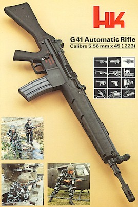 G41和HK33一样是发射5.56mm北约标准弹的,但使用M16的标准弹匣,并增加了抛壳口防尘盖、辅助推机柄、提把、空仓挂机柄及解脱按钮等借鉴M16的零件。G41曾在1979年9月交付部队试验,并在80年代初期参与意大利军方新式步枪投标。G41开发时,所有的经费都由HK公司独力负担,结果意大利国军方没有采用。由于G11的发展计划遥遥无期,HK公司也希望G41突击步枪能临时满足德国军方对5.56mm步枪的需求(有资料提及联邦国防军也短暂装备过G41,但未见到有相关的影像资料证实)。G41某种意义上算是HK33和M16的综合体,不过大多数潜在用户会选择购买M16或是HK33,而非这两者的混合体。此外G41的价格较贵,每支G41大约要1,700美元,同一时期的M16或HK33要便宜得多,G41在超凡脱俗的价钱上却体现不出超凡脱俗的性能,所以它的销售情况不理想。目前被发现土耳其宪兵仍在使用G41,不过土耳其的G41也并非HK原产,而是土耳其的军工企业MKEK获得HK的授权生产。另外意大利弗兰齐公司也曾被授权生产G41,并命名为LG Mod.641,但在参与伯莱塔AR70/90的竞争中失败。
