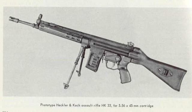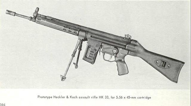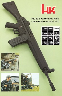 自从1958年M16被美军选用,世界上掀起一片小口径步枪的风潮。为顺应市场需要,HK公司以G3步枪为基础开发出几种不同口径的步枪,HK33是以G3为基础而开发的第一支使用5.56步枪弹的自动步枪。HK33在德国基本上没有装备,但在第三世界国家相当受欢迎,出口型一般被称之为HK33E,E是出口产品的意思。HK33通常配25发钢弹匣,40发铝弹匣也不少,最近HK公司向执法机构和军用市场推出钢制30发弹匣,弹匣非常坚固,能承受车辆的辗压。目前装备HK33的军队有马来西亚、智利、泰国等,土耳其在1999年开始特许生产HK33。此外还有一些国家或地区的特种部队或执法机构少量地采用HK33,比如英国陆军的制式步枪是L1A1和SA80,但英国SAS却有装备HK33KA3。