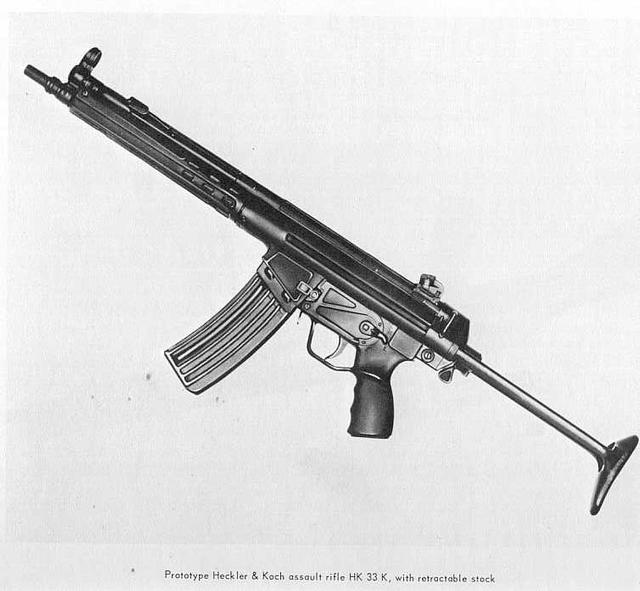 HK33系列中大多数的型号是HK33A2和A3,前者为固定枪托,后者为伸缩枪托。另外还有短枪管型的HK33K。