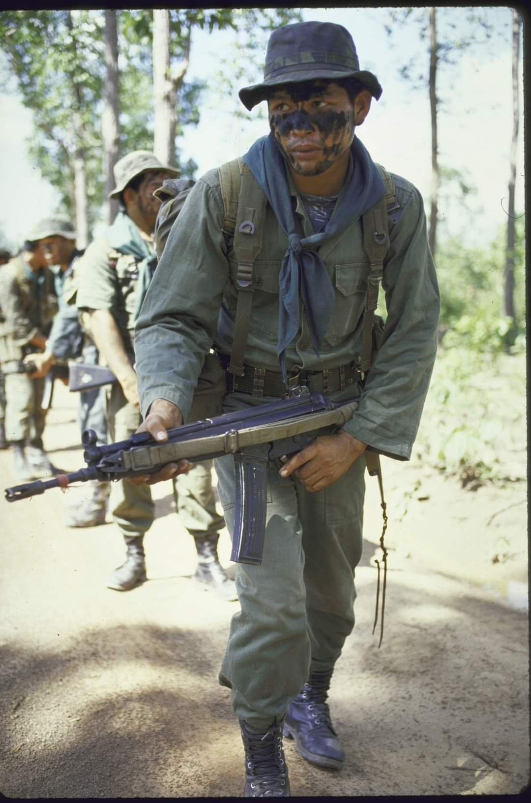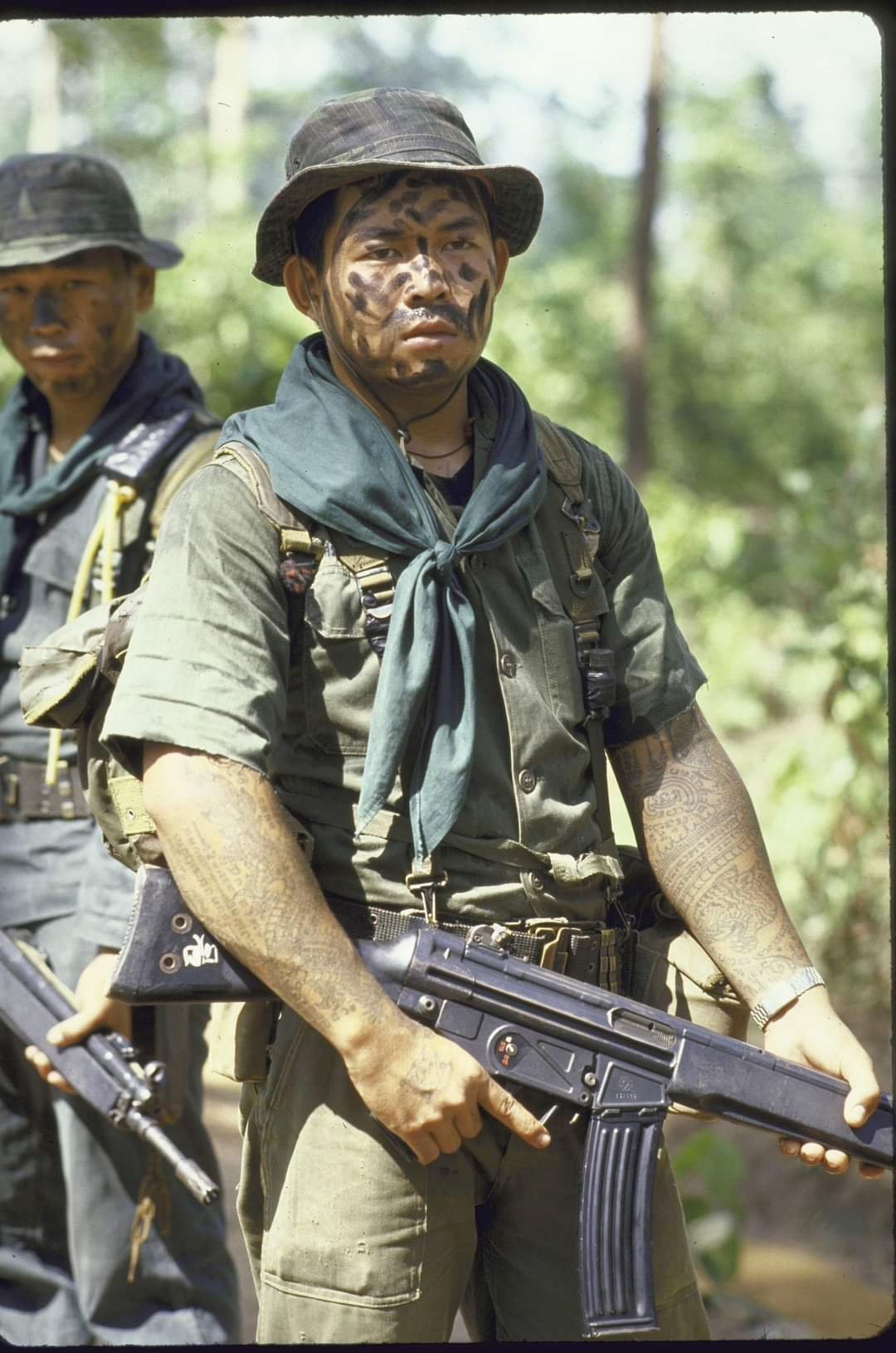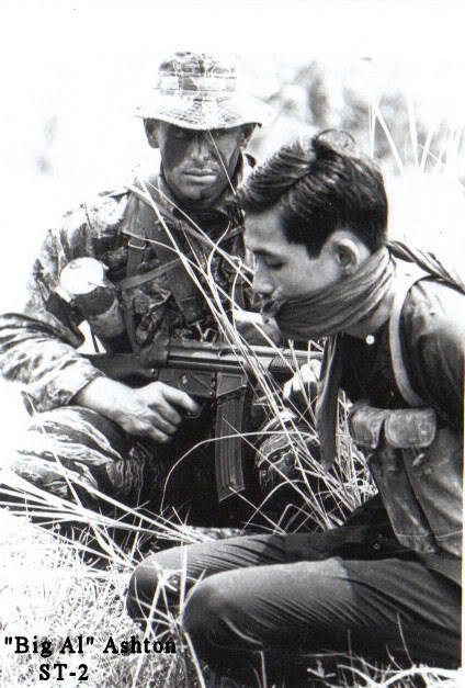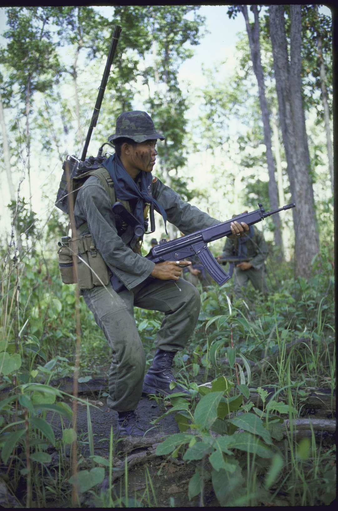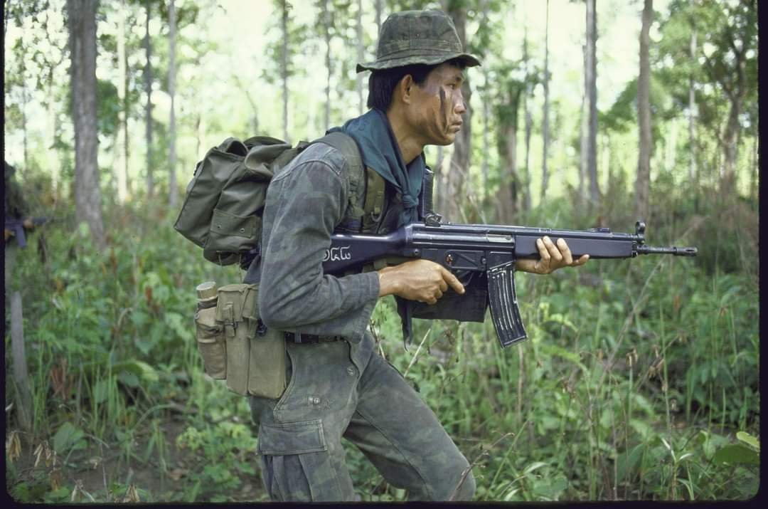 海豹在越南曾少量使用过H&R T223突击步枪,但据说也有少量进口过带空仓挂机的早期型HK33,图中配的弹匣可能是40发