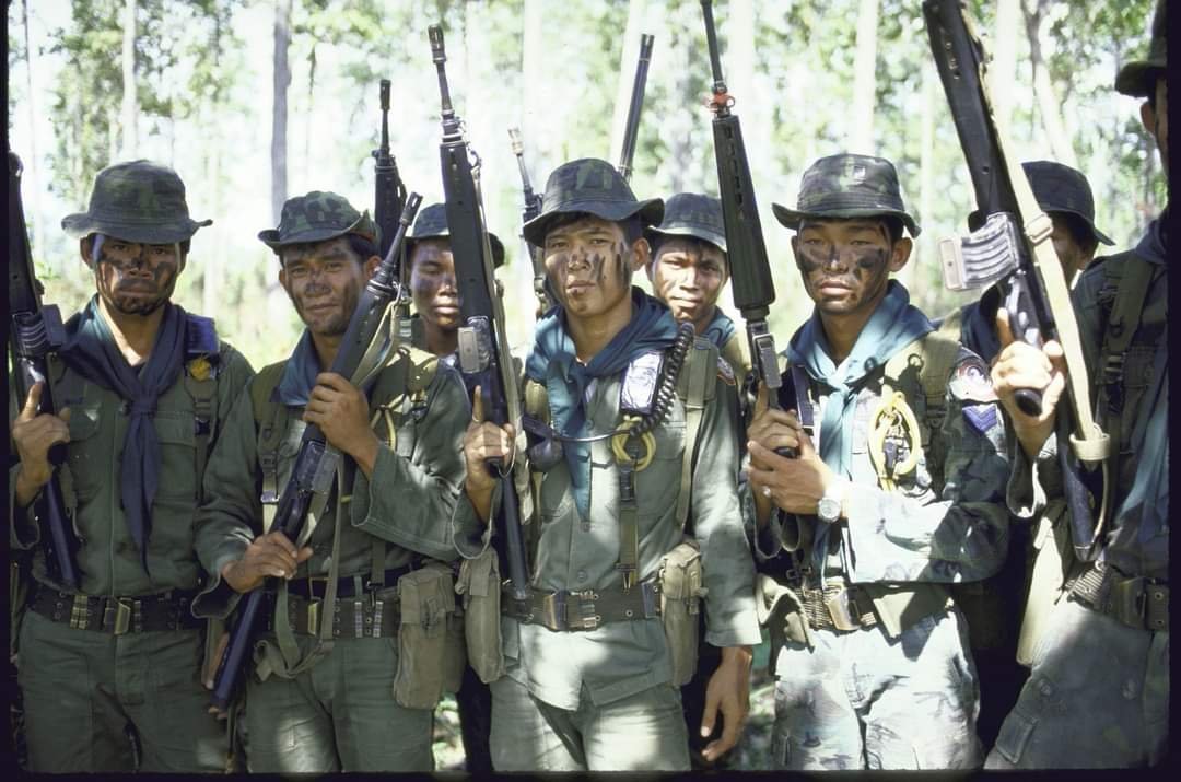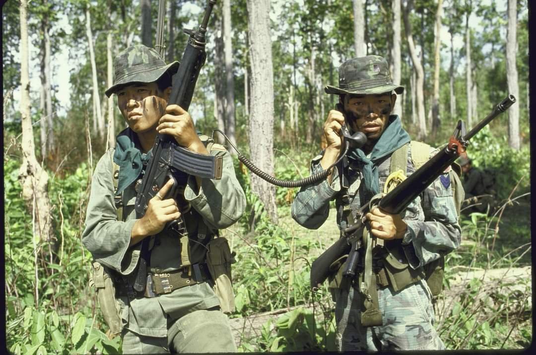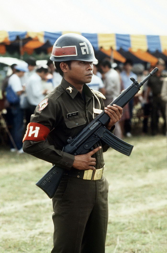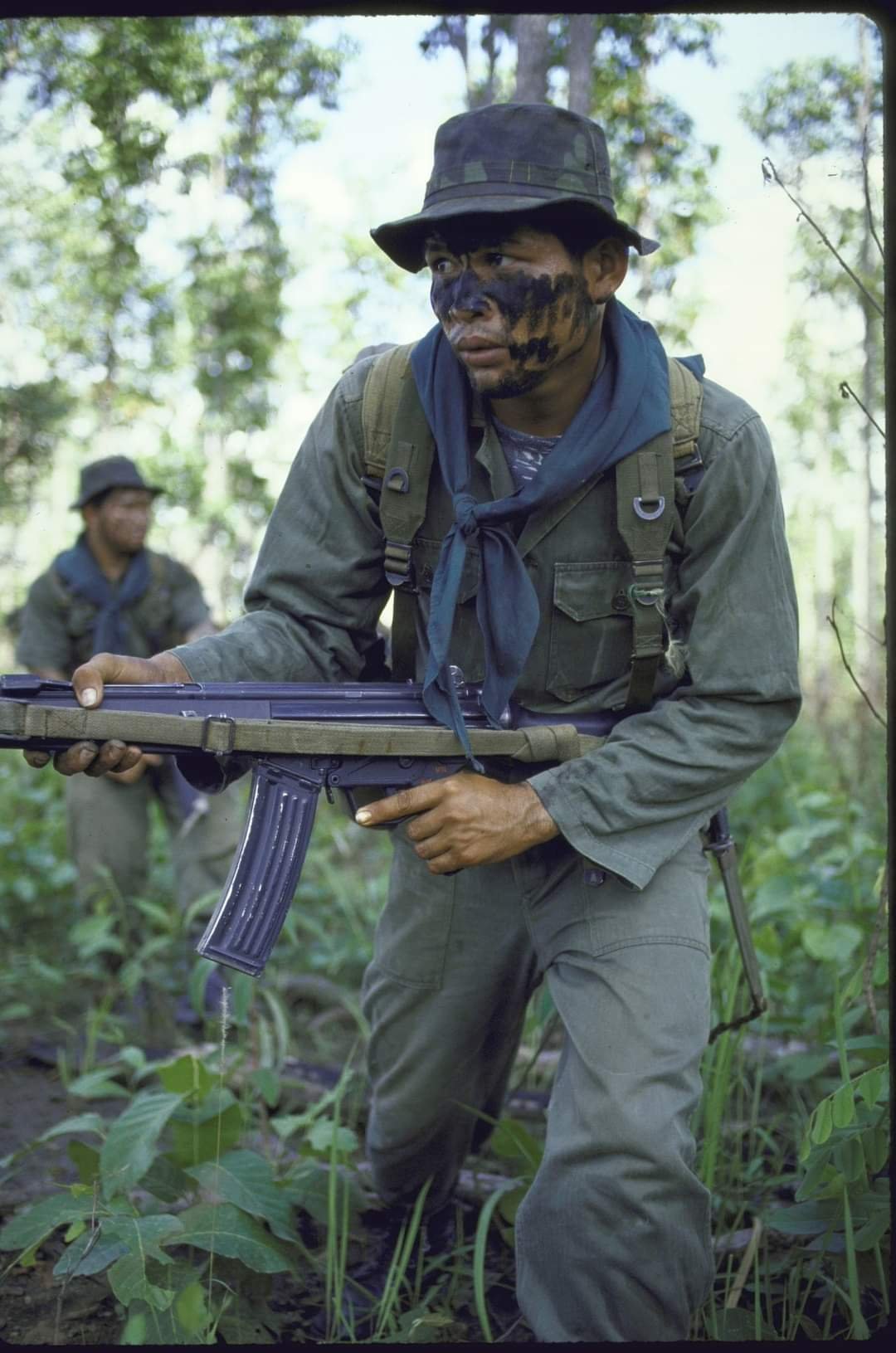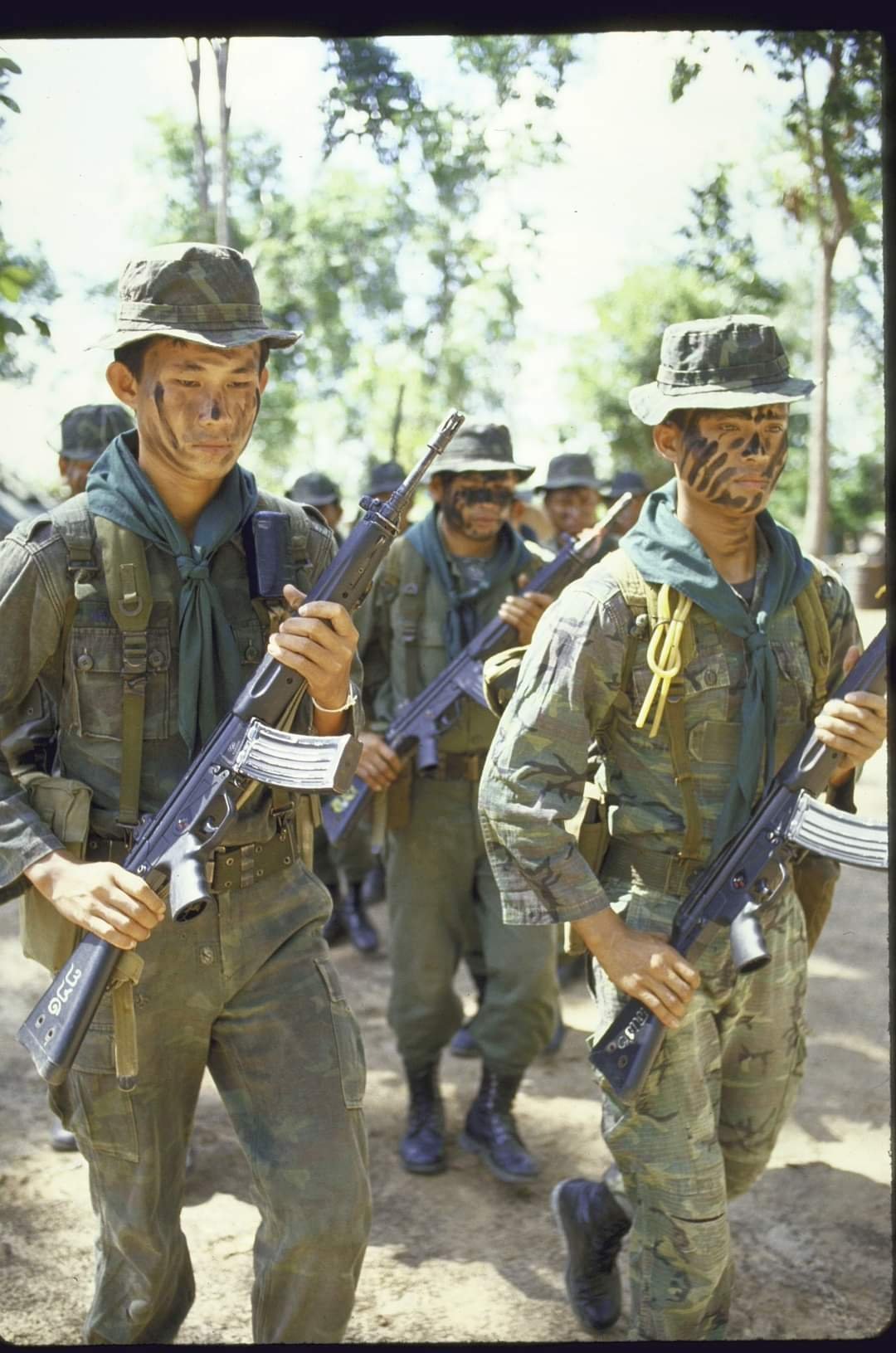 海豹在越南曾少量使用过H&R T223突击步枪,但据说也有少量进口过带空仓挂机的早期型HK33,图中配的弹匣可能是40发