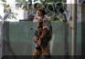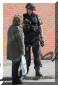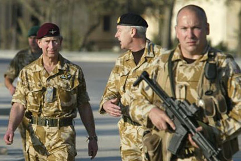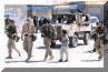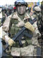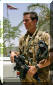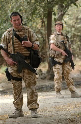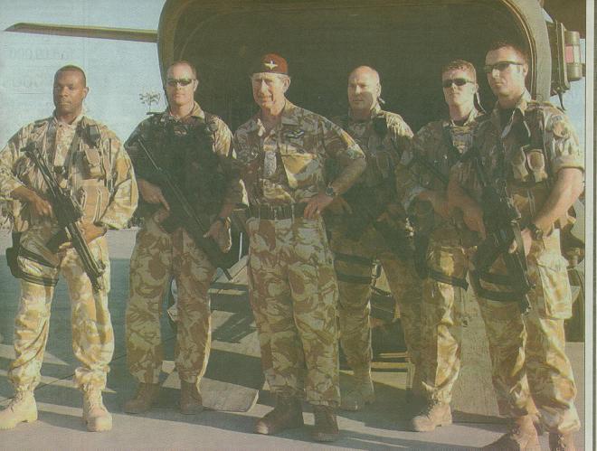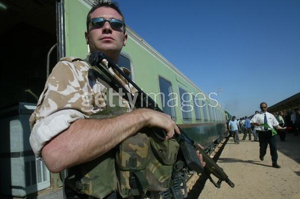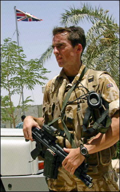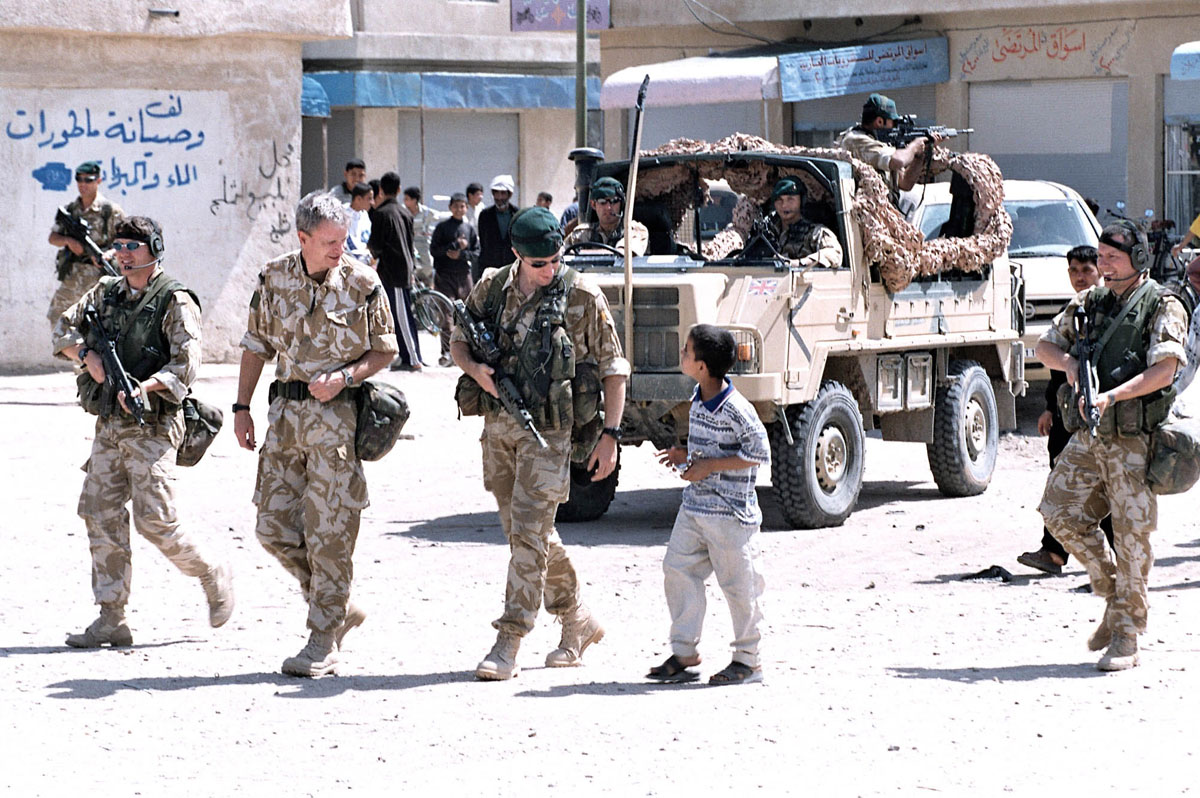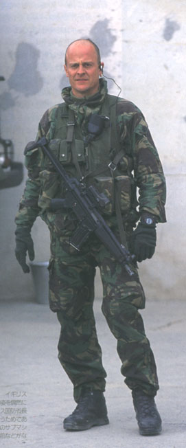 在伊拉克战争中的英国皇家海军陆战队第3突击旅的旅长在巡逻中与伊拉克小孩交流,图中一左一右两名手持HK53的护卫应该是RMP队员![]() |