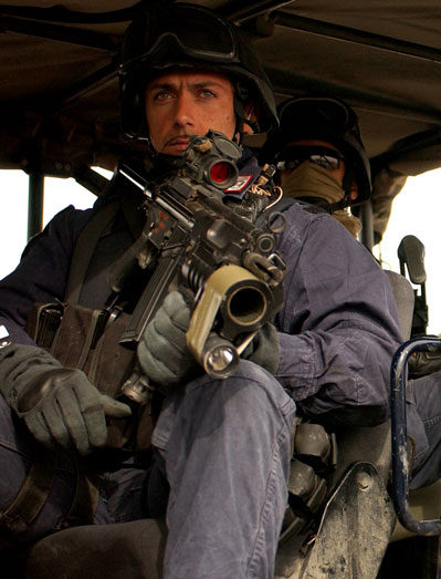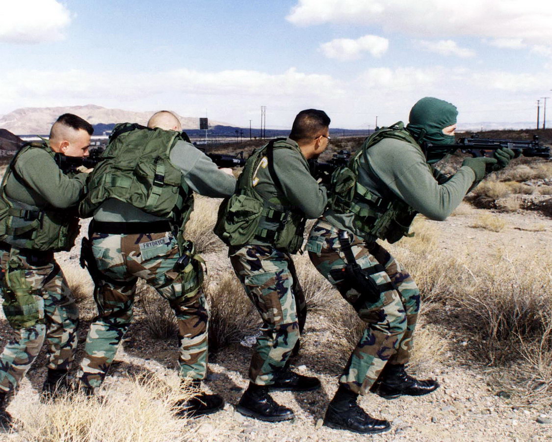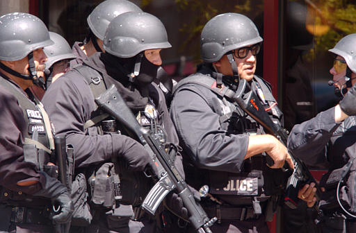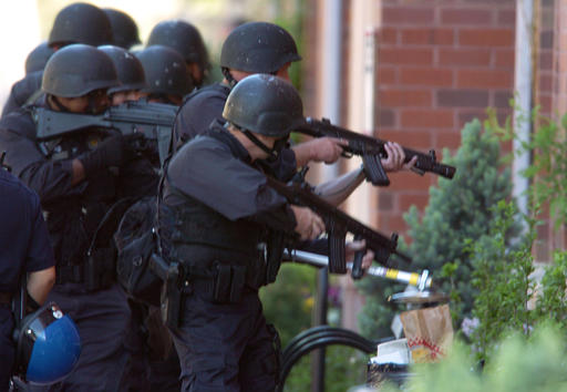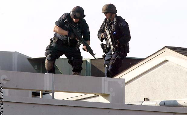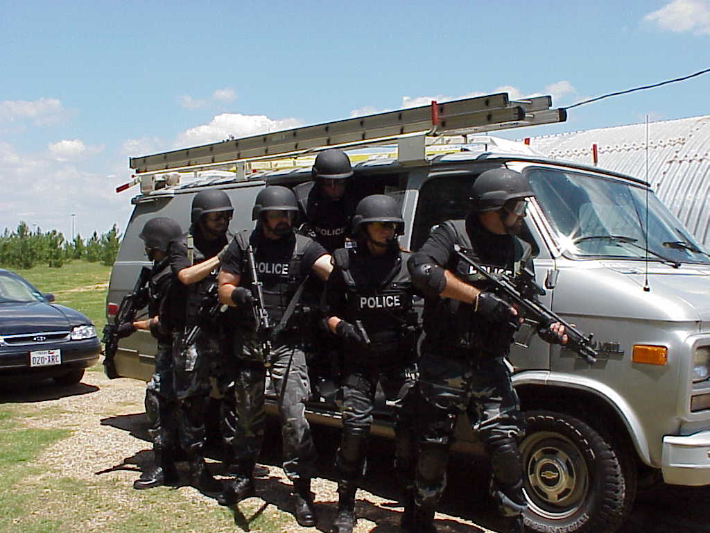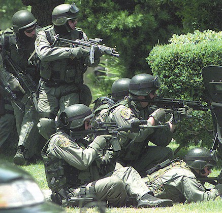 在1999年7月28日,Escondido的控暴战术行动队在一起人质解救行动中的照片。人质中有三名小孩。最后无人伤亡。照片中有6件武器,包括3支看起来好像MP5和3支装有SURE-FIRE千禧版战术灯的M16突击步枪(虽然是16吋枪管但明显不是M4),其实3支MP5中有2支是装有SURE-FIRE战术灯的HK53A3,另1支才是MP5A3。