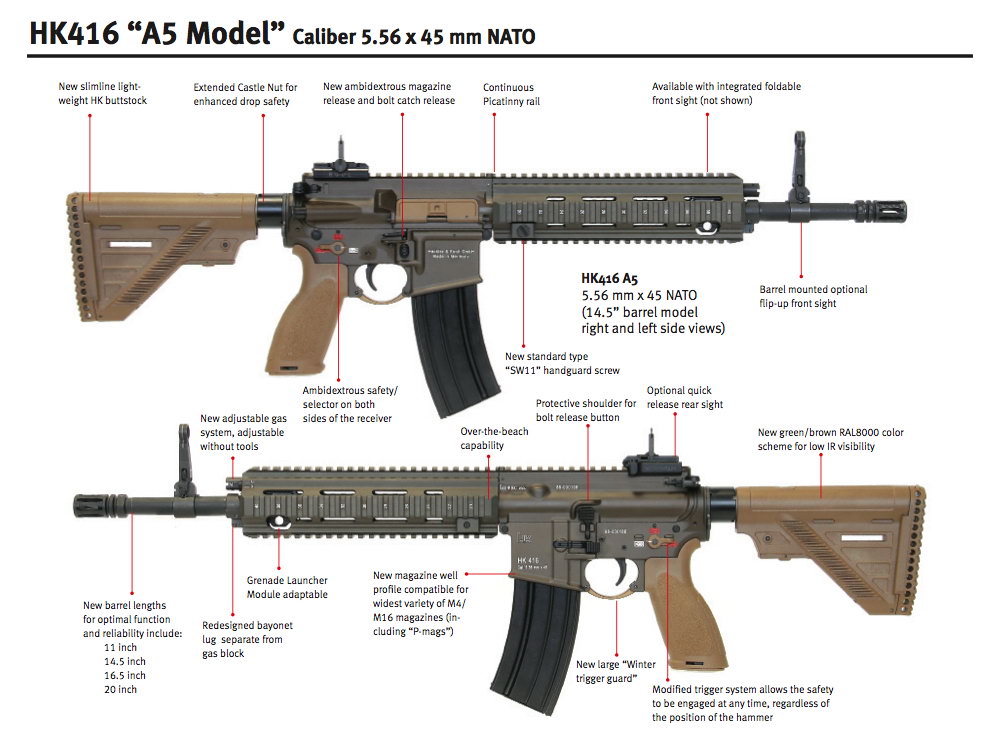HK416A5是HK416系列的第一个重大改进型号,于在2012年推出。在这之前被广泛采用的各种HK416其实大多是HK416A2。
