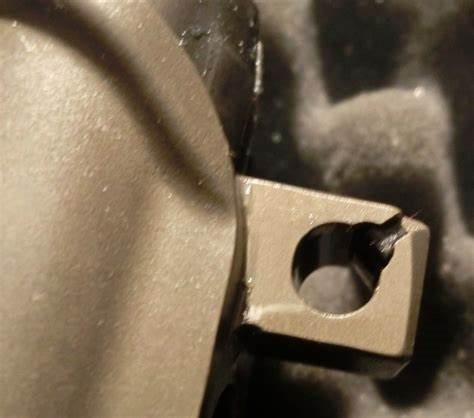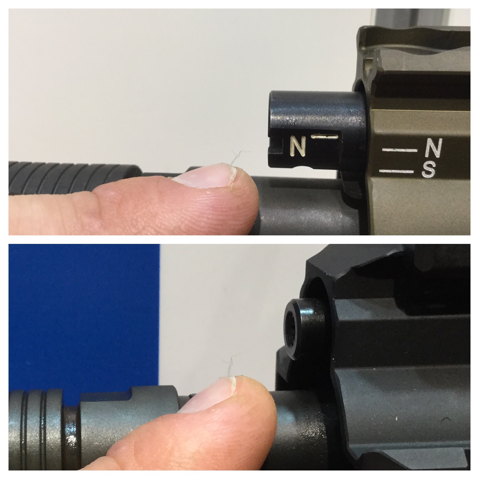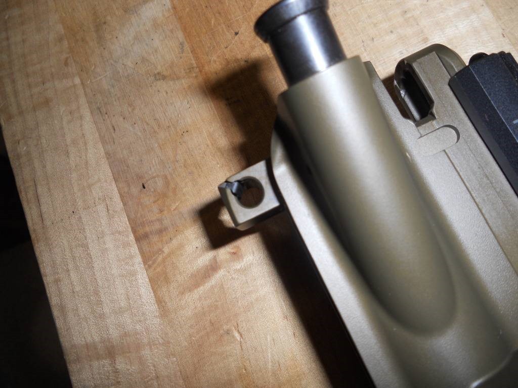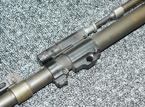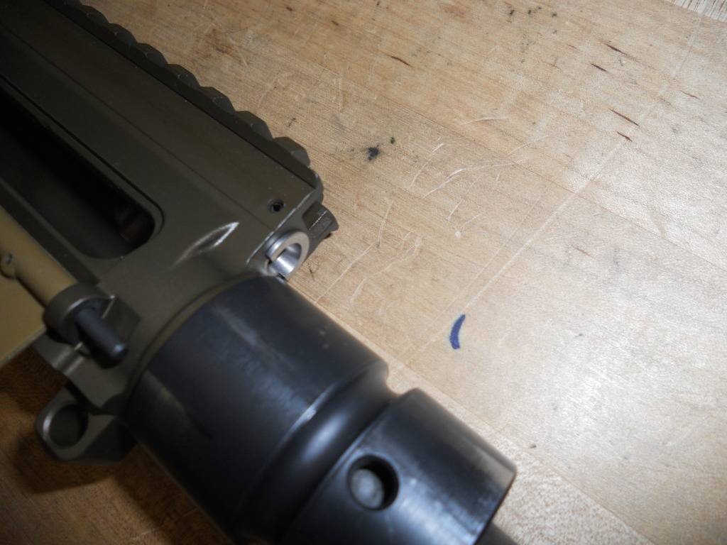 HK416A5的活塞导杆孔,和HK416的形状不同,机匣前端活塞杆入口处的套座由螺纹固定改为了“A5式”的销子固定(注意侧面的小黑点),这样的改进提高了套座的寿命