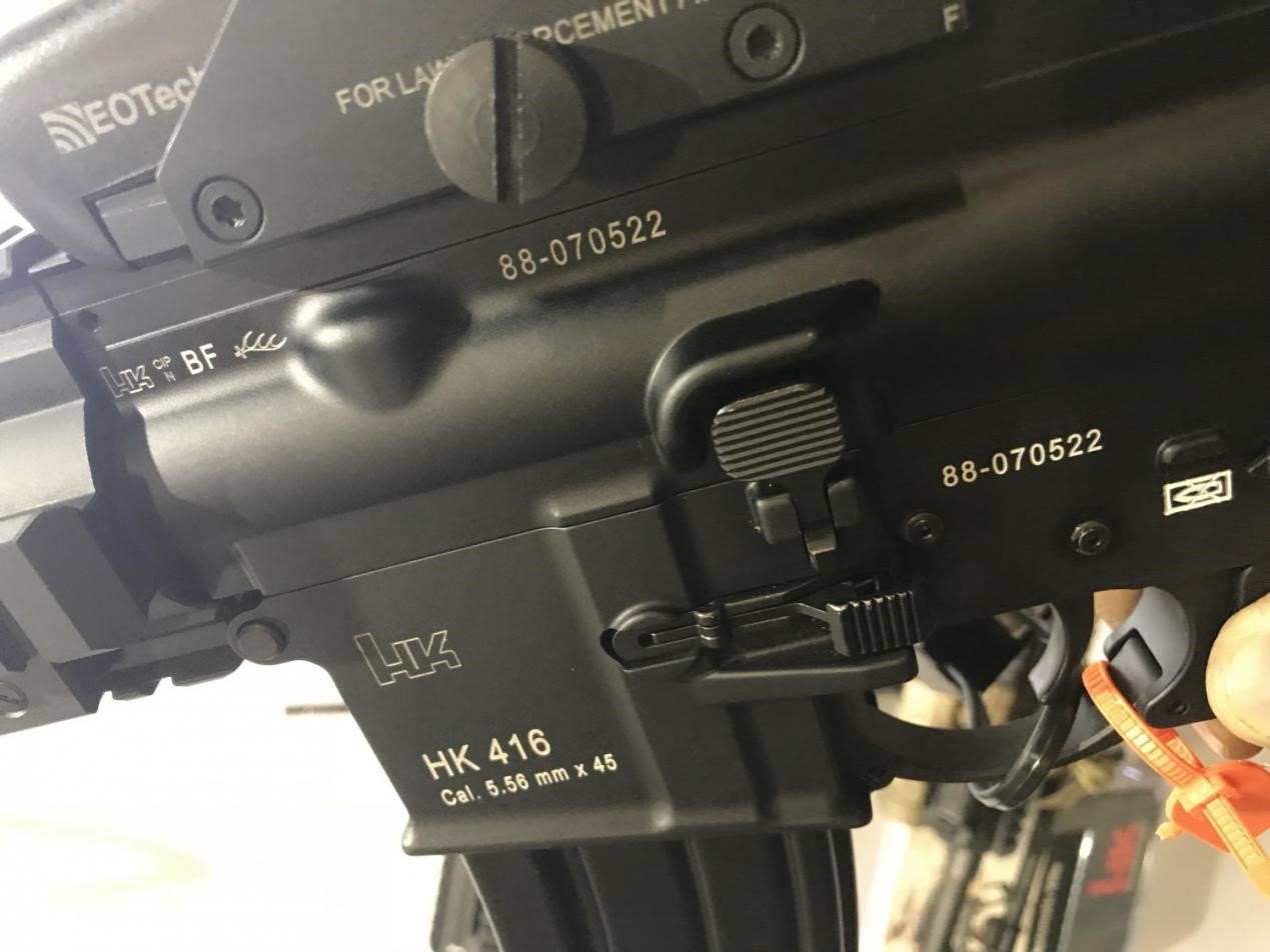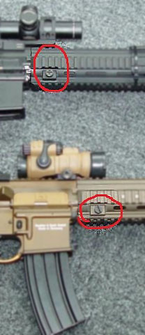 ![]() HK416F的机械瞄具是新的,护木固定螺丝的安装金属块棱角比HK416A5的更圆滑 |