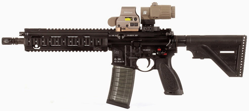 在2014年,传出有德国政府第一份HK416的订单的消息,是某家执法机构采购了11英寸型的HK416A5,并按照规矩将之定型为G38。当2015年德国海关(ZOLL)在一次公开演练中使用了HK416A5时,看来就是海关装备了G38。然后在2015年的时候,HK416A5的销售量大爆发,许多国家的特种部队或执法机构都采用HK416A5,包括波兰、土耳其、法国等等,而法国特种部队也在2016年1月的布基纳法索人质事件中使用了HK416A5进行解救行动。另外,根据HK德语官网上几份对HK经理的采访,这位经理提到了G38是包括HK416A5和HK416A6两种,而HK416A6其实就是重型枪管的HK416A5。但目前没有找到HK416A6的图片。