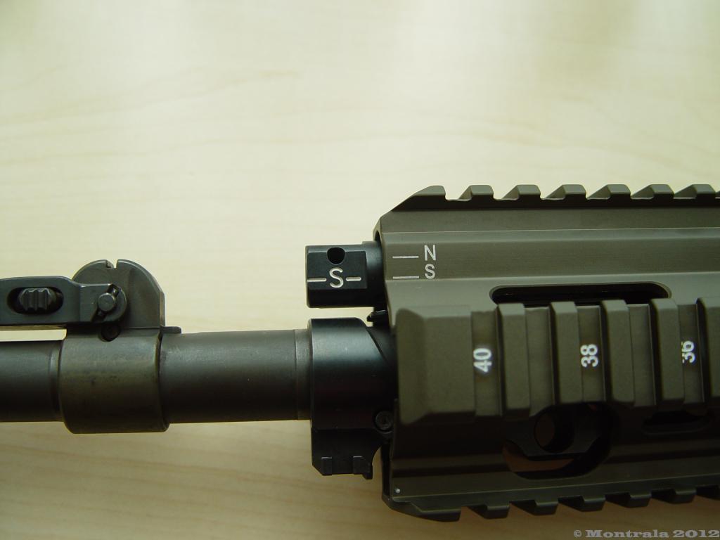 ![]() 步枪在使用消音器时,火药气体在枪口处泄压较慢,因此只需要小导气量就能满足需求,在安装消音器时仍使用大导气量可能会导气枪机后坐变快,射速变高。HK416A5共有两个导气量,S代表消音器(Signaturdämpfer),N则是一般(Normalerweise)情况下的导气量。另外,导气箍上的刺刀座前移,和导气箍分离。 |