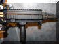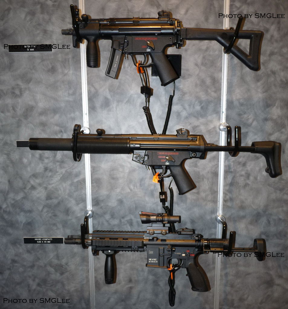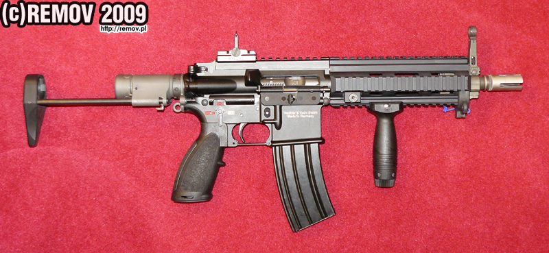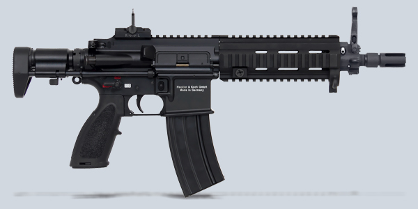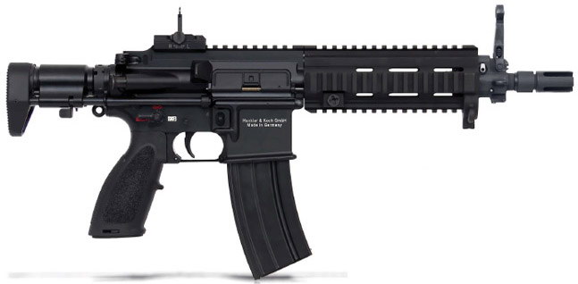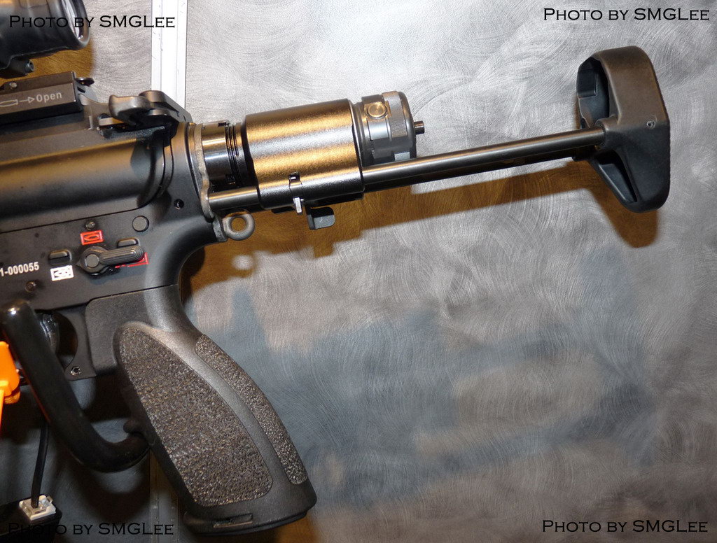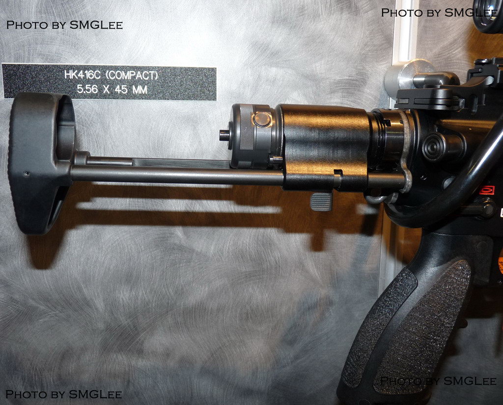 作为最短的HK416系列,该枪不仅是因为枪管短(只有226mm),HK公司还设计了一种紧凑型的伸缩式枪托。尽管HK416和传统AR一样在机匣尾部有一根缓冲管,但HK416C的伸缩式枪托把只有一块前后距离很短的托底板,用两根平行钢管前后滑动来进行伸缩,因此缩起枪托后,比传统的M4伸缩枪托要短得多。