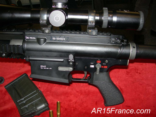 上图是2005年下半年我在国外Ghost Recon的MOD论坛上偶然发现的,一直以来“据说”的7.62mm口径版的HK416——HK417就是这个样子了。根据英国《简氏防务周刊》2005年10月26日的报道,HK公司利用HK416的生产线推出了HK417,并在美国陆军协会(AUSA)2005年年会上推出的。