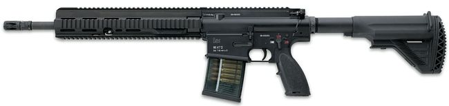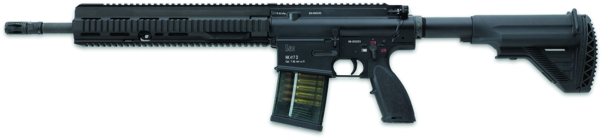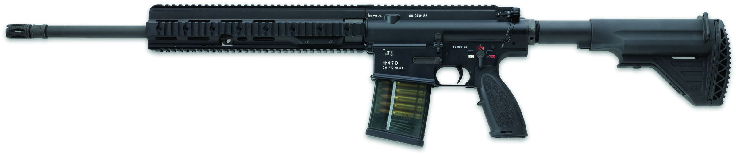 HK417是HK416的7.62×51mm NATO口径型,HK416与HK417的关系就像SCAR-L和SCAR-H,是同一枪族的两种口径型。HK417配用G3的20发弹匣,除口径不同外,其他方面与HK416基本相同。目前已在亚利桑那州完成了为期2周的沙漠试验,试验中发射了20,000多发弹,试验的样枪枪管长317mm。在2006年SHOT SHOW上,HK公司展出了一种外观与早期稍有不同的HK417,但从2008年开始推出的HK417量产型的外形与2006年时的原型枪又有所不同,而且弹匣从原来的金属弹匣改为半透明塑料弹匣,容量有10发和20发两种,另外可配50发塑料弹鼓。HK417目前已少量装备了一些国家的特种部队或特警队。