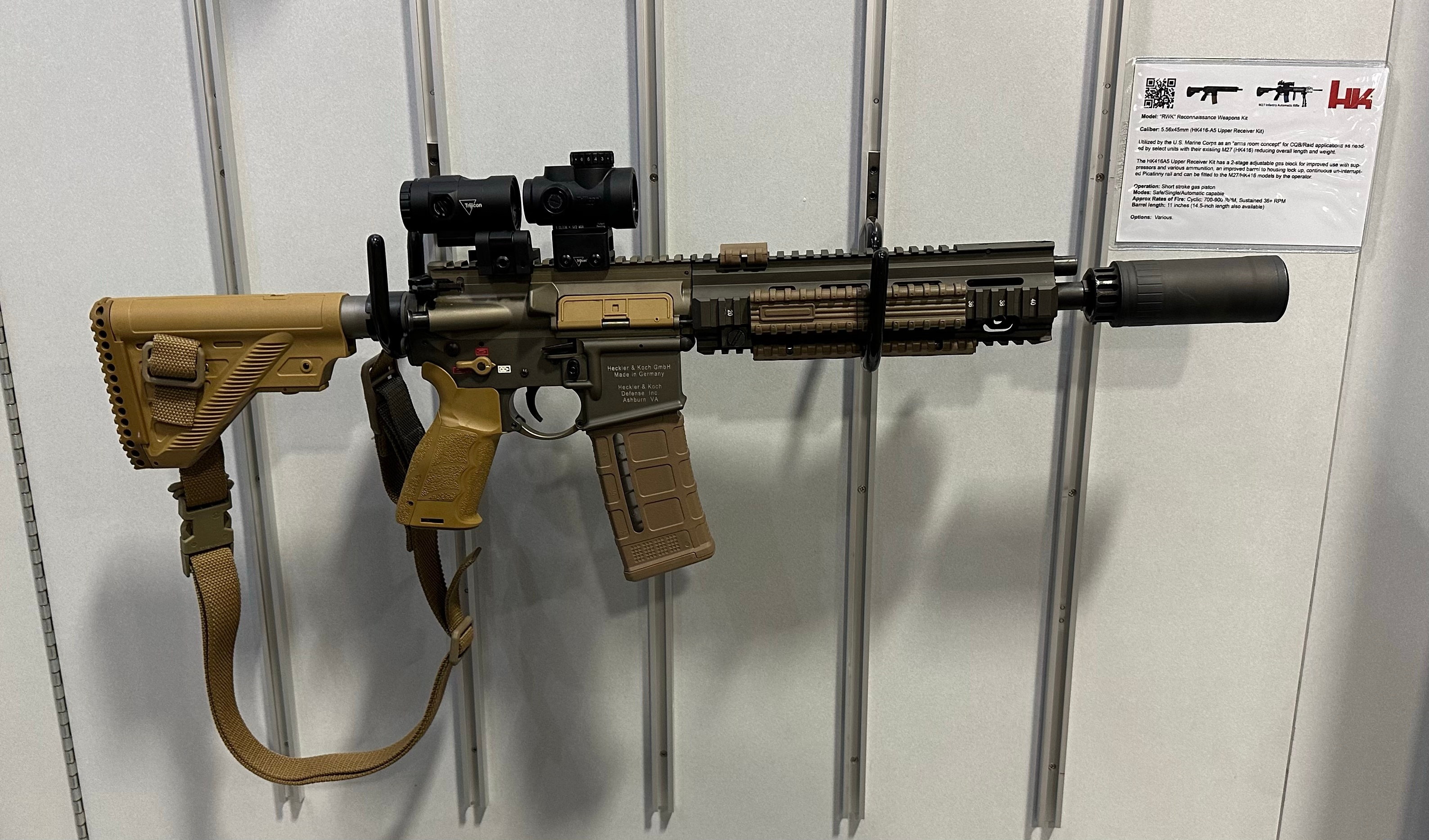 M27侦察武器套件(Reconnaissance Weapons Kit)其实就是把M27的16.5英寸枪管换成11英寸(约279mm)枪管的CQB版本,据说采购订单来自海军陆战队的侦察部队,不过他们并不是订购枪管回来自己安装,而是订购包括枪管在内的完整的HK416A5上机匣进行更换。这是因为M27的护木是比HK416的标准护木长出一截,如果使用11英寸枪管则需要较短的标准护木,由于购买的是A5上机匣,所以一些A5上的改进功能也被包含到这套M27 RWK上,比如改进后的可调节导气箍。其中海军陆战队第二师第二侦察营于2021年5月开始首次使用这种M27 RWK,而后这种短管型的M27还可能装备了美国海军陆战队其他的侦察部队,包括远征军直属侦察连(Force Recon)。购买A5上机匣的原因,是因为陆战队的侦察部队编制里没有短步枪,他们不能像SOCOM的MARSOC那样需要短枪了打个报告就能领到,为了方便采购,陆战队就直接购买了A5上机匣,毕竟上机匣算配件,下机匣才是枪,按美军的装备采购制度,买配件比买枪容易。(B站@Zenith_Concepts补充)