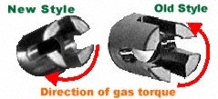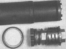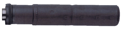 这种消声器有5个消音隔板,在消声器里注入几毫升水后效果更佳(即湿式状态)。注意,该消声器原本是KAC为柯尔特的SOCOM样枪所提供的消声器,USSOCOM没有采用柯尔特的样枪,却接受了KAC设计的这个消声器,并在第2阶段的合同中规定HK的样枪必须采用,于是HK公司就放弃了原来的矩形消声器。不过KAC也对消声器作了改动,原本在柯尔特的样枪上是固定在套筒上的一个门闩形的搭扣装置上的,现在则改为旋在螺纹枪管上。另外KAC也为SOPMOD M4、MP5-Navy、Beretta 92等等一系列武器提供了相同原理的高效消声器。为保证安装消声器后,枪管依然能正常后坐开锁,该消声器的接口采用了尿尔森装置(即下图中的活塞组件)。(湿式原理及尼尔森装置详见《消声器结构和原理》)