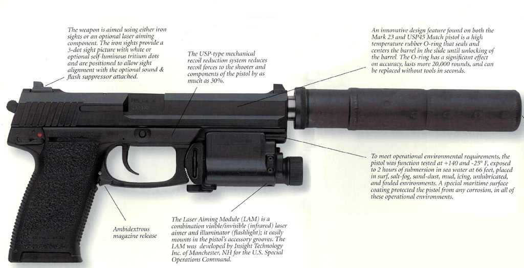 尽管Mk23手枪早已被配发到特种部队中,但据传作战人员对这种“进攻型”手枪并不太感兴趣,这主要是因为它实在是太大了,感觉就好像沙漠之鹰一样,在外形尺寸上有得一拼,即使不安装LAM和消声器,要单手射击仍不太方便。USP战术型就解决了尺寸过大的问题,而且好像比Mk23更容易流行。另外,整个Mk23 Mod 0系统太贵,也不可能装备到每一位战斗人员,因此很多特种部队也采用了其他型号的手枪和消声器——不管是用来“进攻”还是“自卫”。不过Mk23手枪有一点当仁不让的特性,就是极端的准确性,简直就像拍图钉一样,在50码内可散布在2英寸以下,即使带消声器射击,散布精度也为6cm。