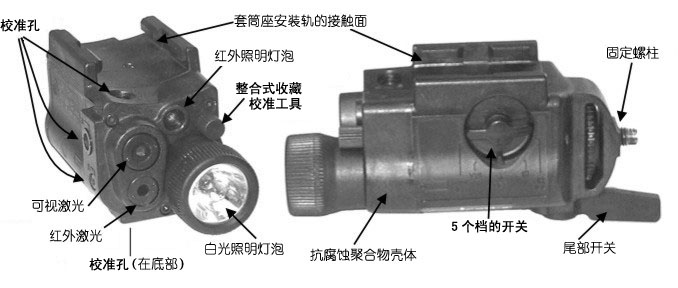 ITI研制的LAM有四种光源。第一种是发出可视强光的卤素灯,据说在25米距离上的焦点能形成一个半径30cm的圆形;第二种是发出肉眼不可见的红外光,也是要用夜视镜才能观察到;第三种是出红色的可见激光(670nm/4.5mw);第三种是肉眼不可见的红外激光(830nm/0.35mw)。四种光源的布置如下图所示。