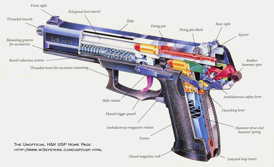 Mk23与USP很相似,不只是外形,它们的大部分技术和生产工艺都是相同的,例如:已经申请了专利的带有缓冲装置能减少30%后座力的复进簧导杆;枪膛镀铬的多边形枪管;含15%玻璃纤维的聚酰胺套筒座;所有金属部件都有耐腐蚀涂层等等。USP先于Mk23研制,这是因为HK公司为拓展美国手枪市场而开发的计划(引用郑某人的话,在USP之前的HK手枪复杂得一塌糊涂),因此HK公司在研制Mk23时是以USP的初步成果作为基础的,但当Mk23发展成熟时,这些技术又拿回去用到USP身上去(Mk23为满足USSOCOM那些严格的标准,使USP在市场上大受好评),所以Mk23与USP其实是一对孪生兄弟,互助互爱。 不过Mk23和USP在结构上也是有很大差异的。首先Mk23比USP更大更长(当然也更重),而且Mk23露出一段带螺纹的枪管,便于安装消声器(USP战术型才有同样的设计);USP的手动保险兼有击锤解脱杆作用,而Mk23的手动保险和击锤解脱杆分离为两个独立部件;另外Mk23的扳机护圈前方有一个带螺纹的小孔用于固定LAM;Mk23比USP重50%。 |
