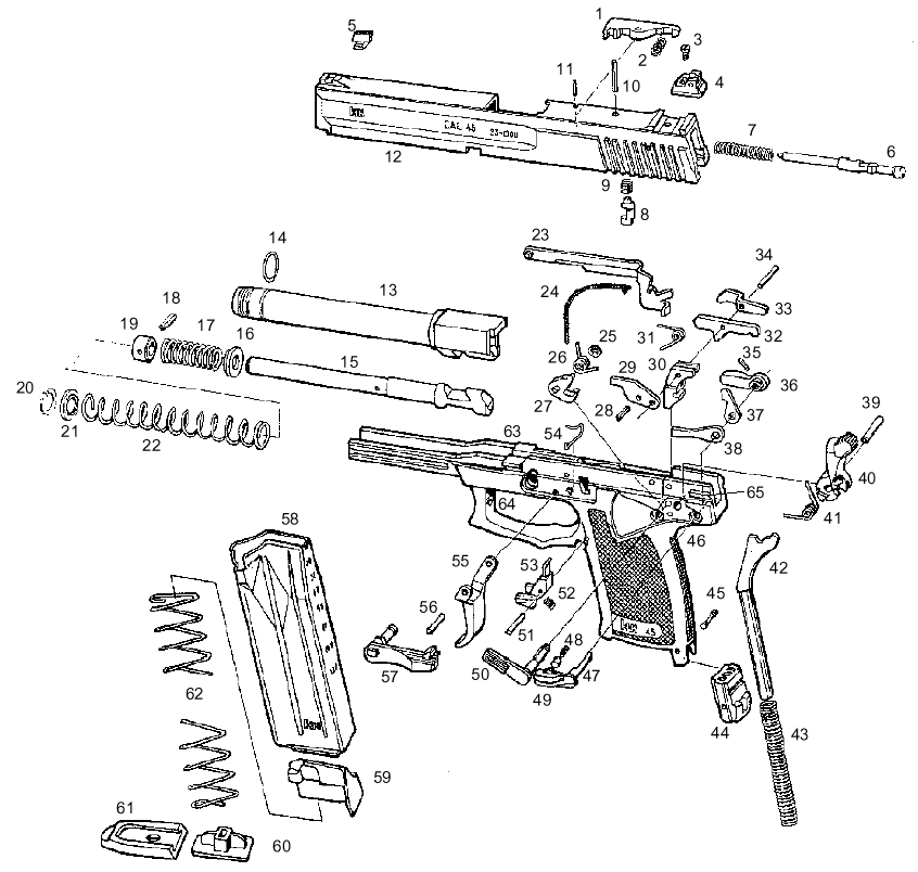 | 7 | firing pin spring 击针簧 | 40 | hammer, complete 击锤组件 |