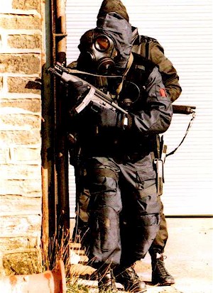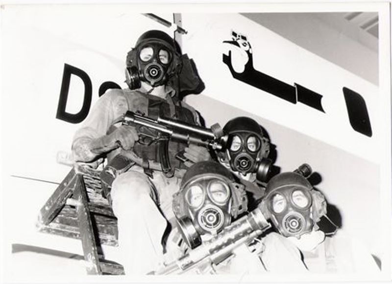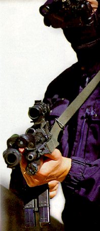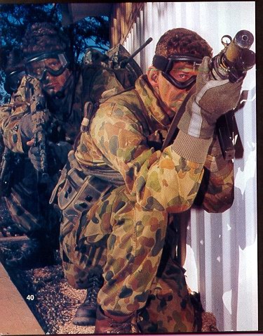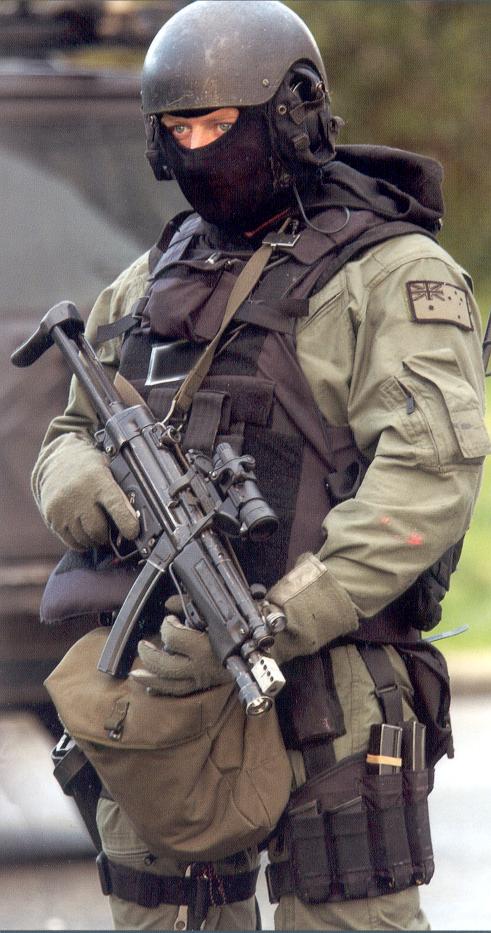 1980年代澳大利亚SASR的反恐分队所装备的MP5,与英国人一样在顶部安装一个大手电,不过衣服却是配绿色的CWU-27P阻燃飞行员,而不是英国SAS的黑色作战服