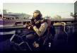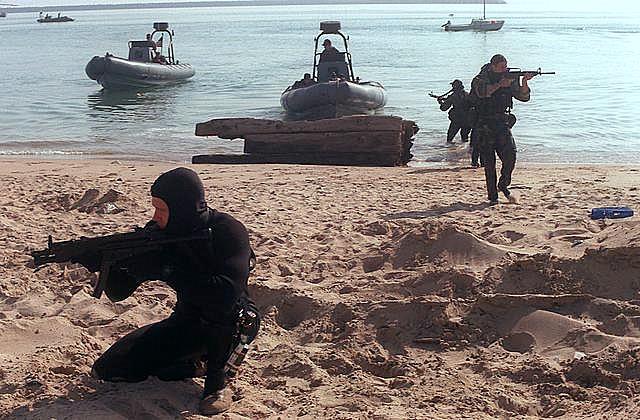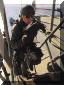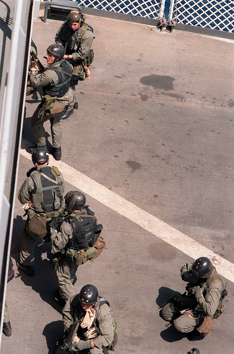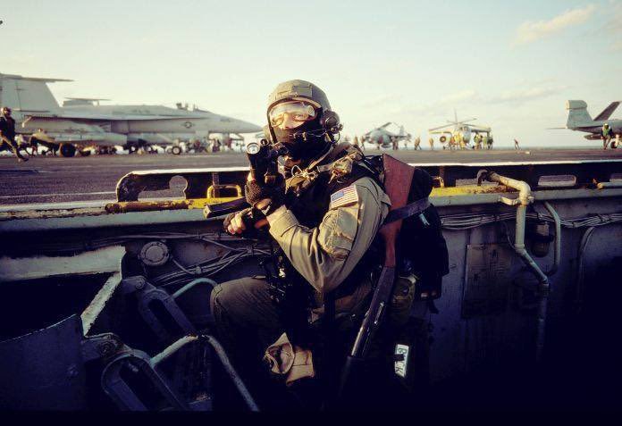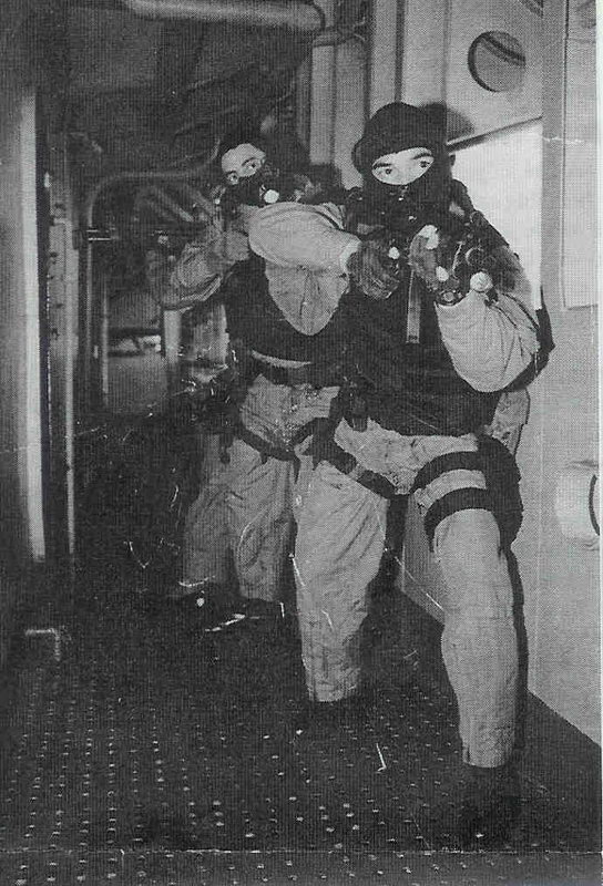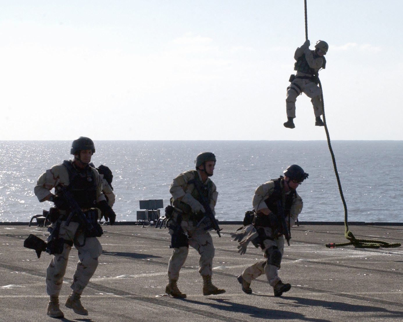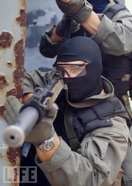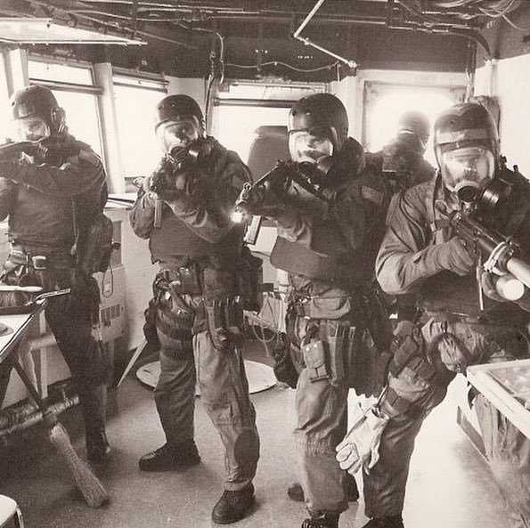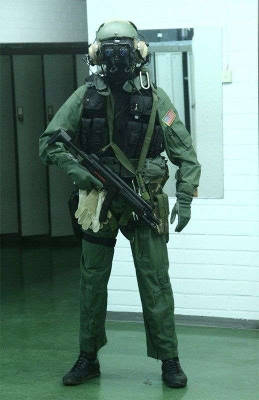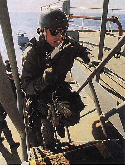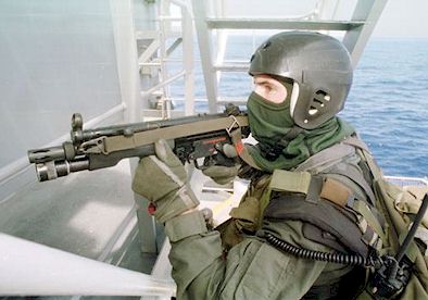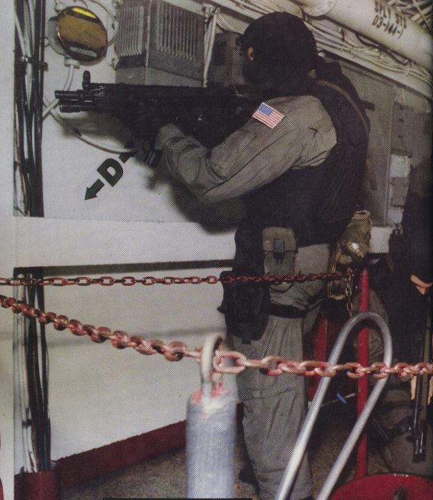 身穿27P作战服、头戴树脂盔的海豹成员正在登船,MP5-N的枪口上装有消焰器,枪口下是SURE-FIRE战术灯