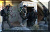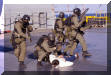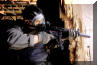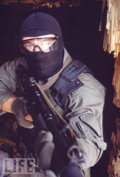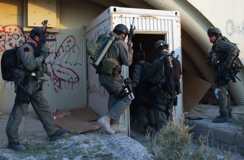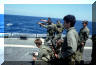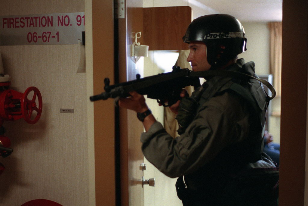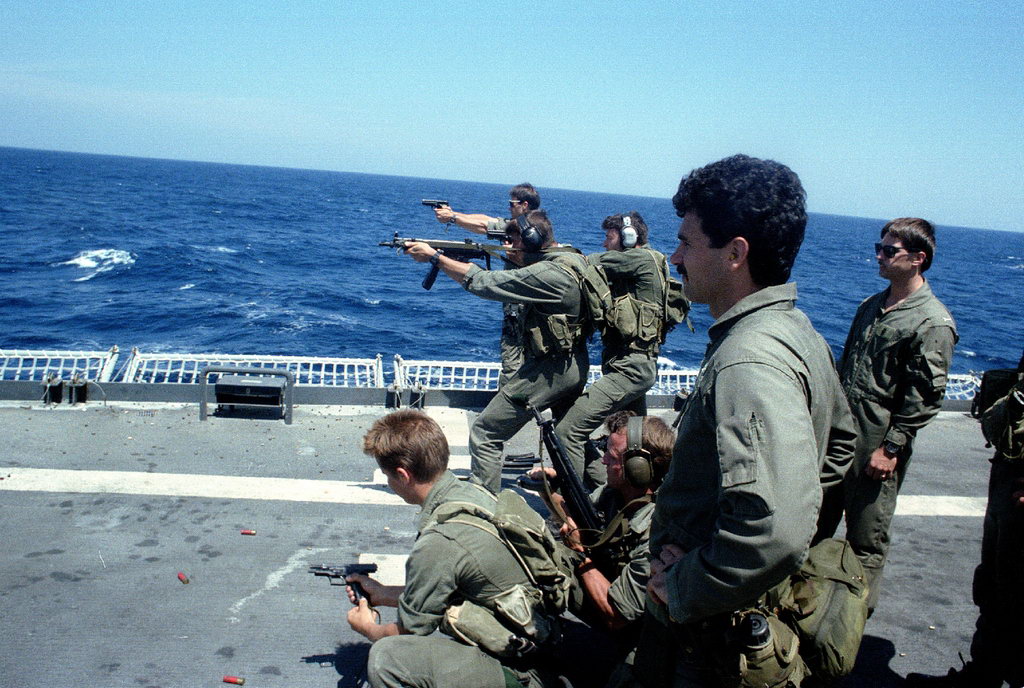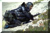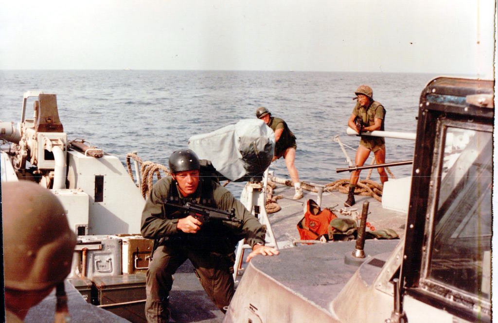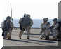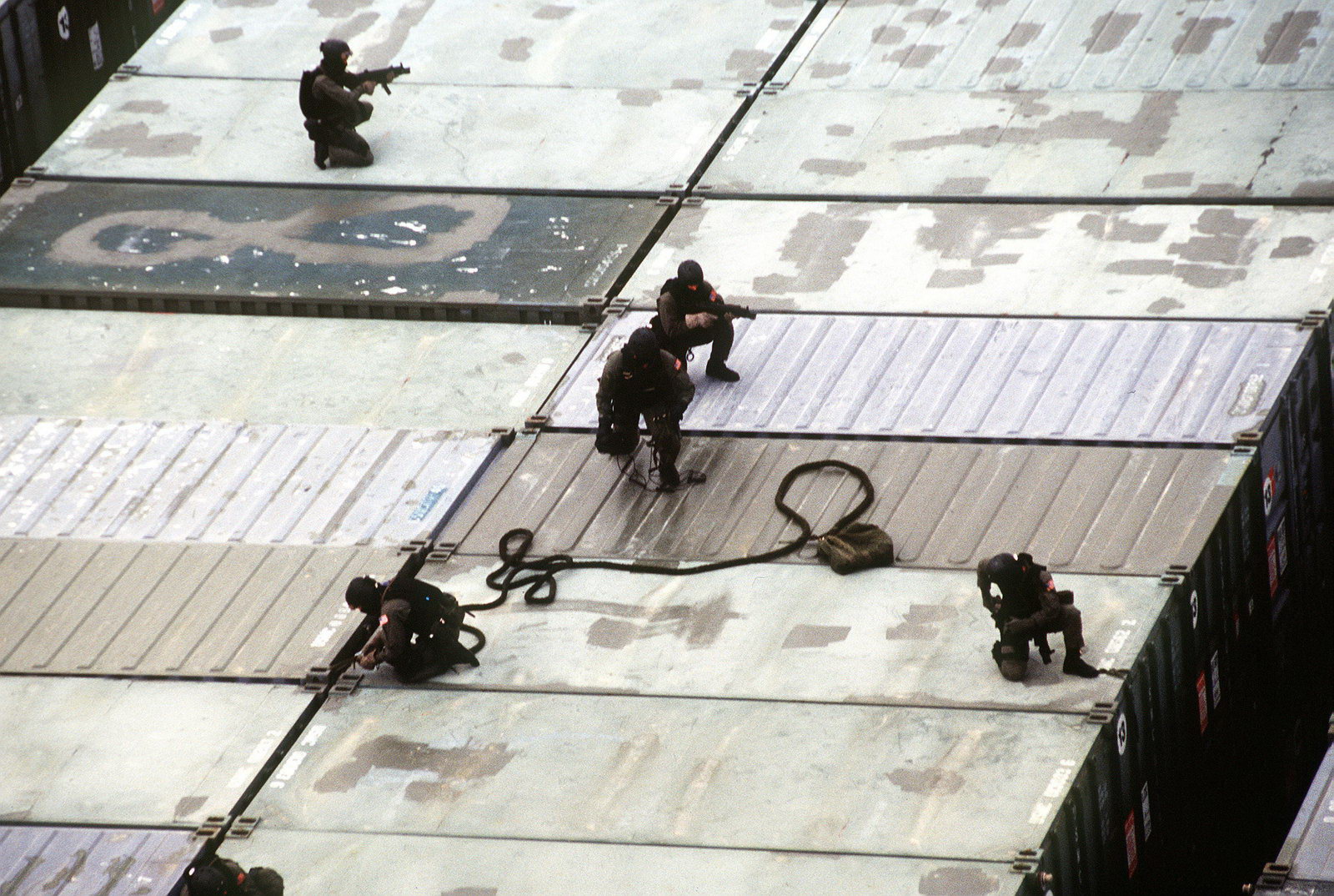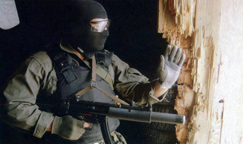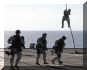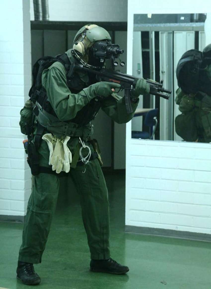 身穿27P作战服、头戴树脂盔的海豹成员正在登船,MP5-N的枪口上装有消焰器,枪口下是SURE-FIRE战术灯