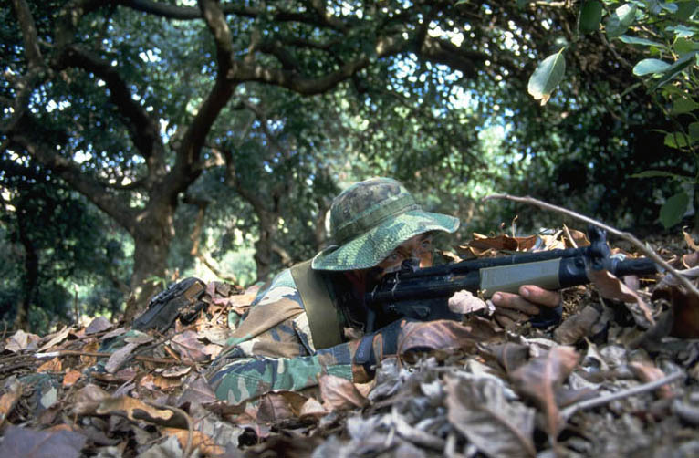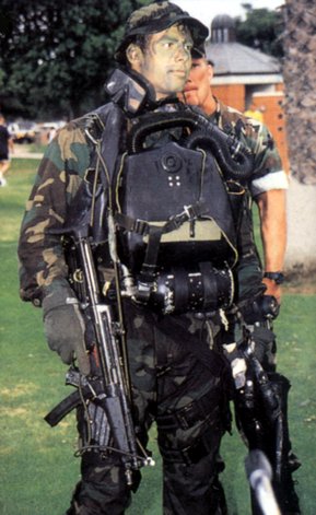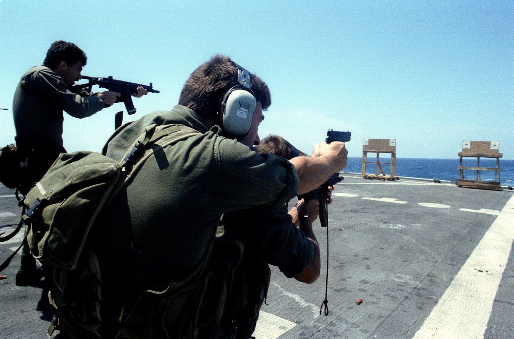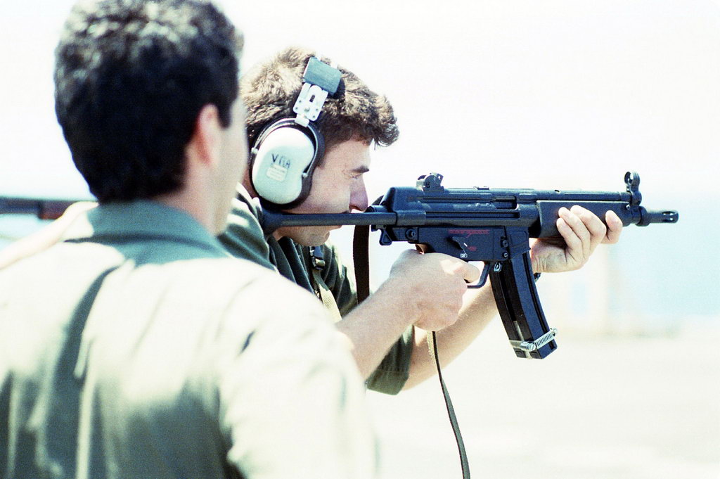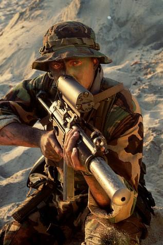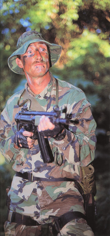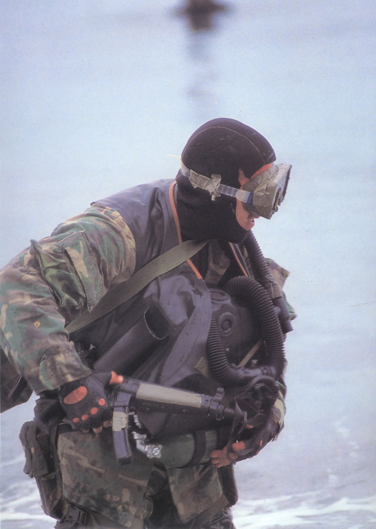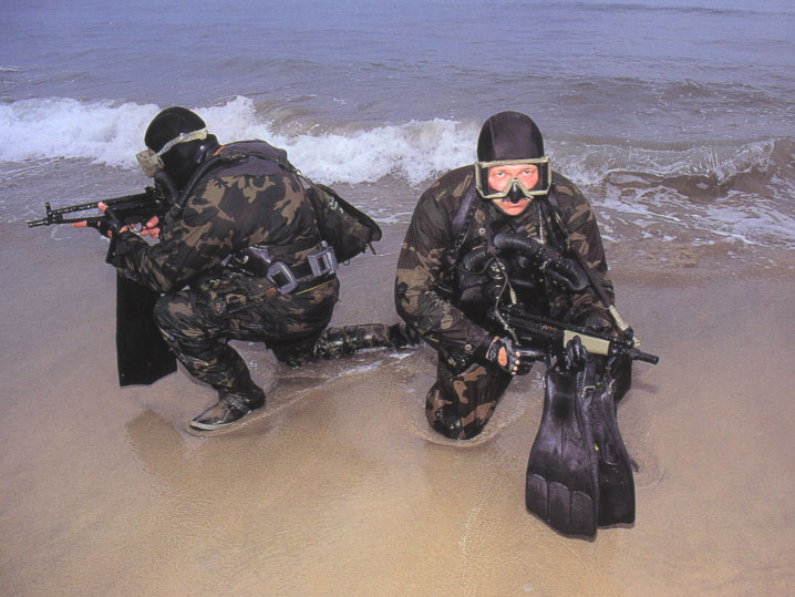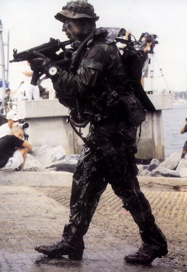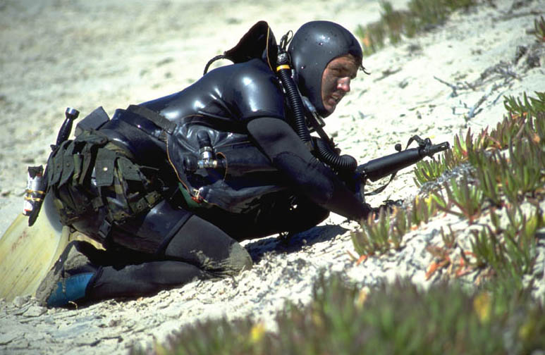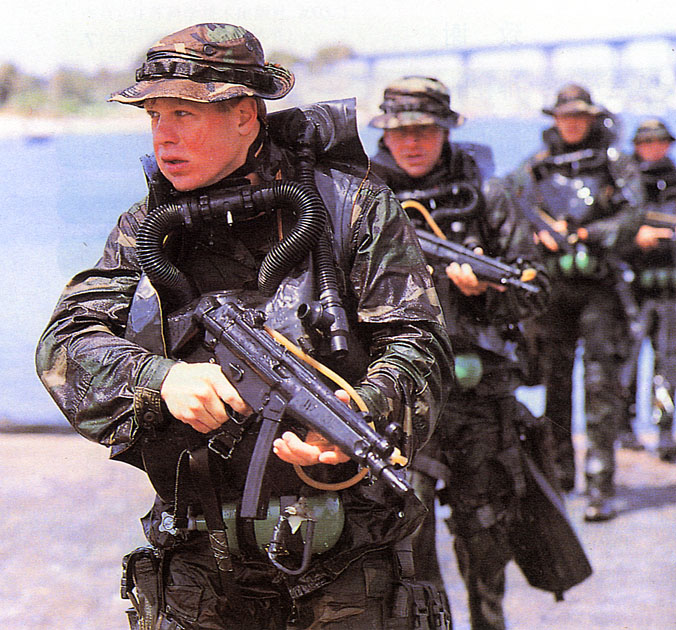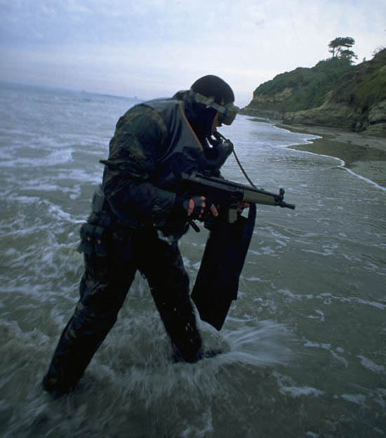 在滩头训练的美国海豹成员,MP5SD-N上的早期激光瞄具十分大而沉重