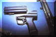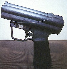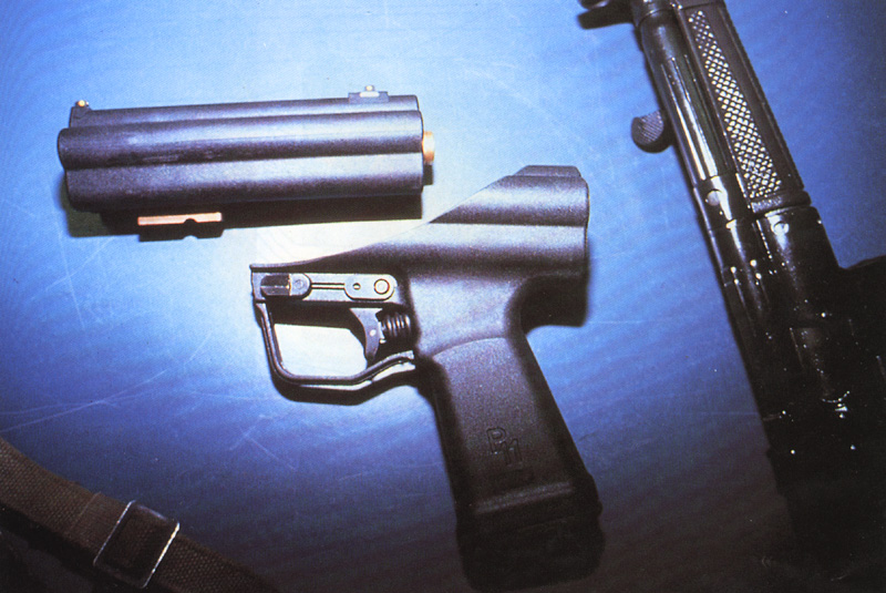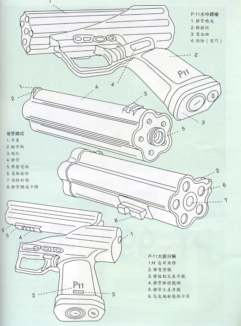 P11的容弹量是5发,没有弹匣,不能自动装填,子弹密封在弹膛兼枪管内,靠电击发。从下面的结构图看来,好像是两个1.5伏的AAA电池,不过只是我的个人估计。由于没有弹匣,枪管和弹匣是整个更换的。P11发射7.62×36mm口径的飞镳弹,如果你想看子弹的图片,对不起,我也没有。P11的枪声比MP5SD略大,水面射程30米,水下射程10~15米。
