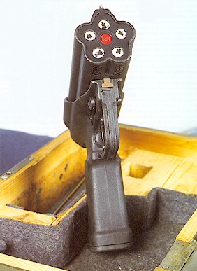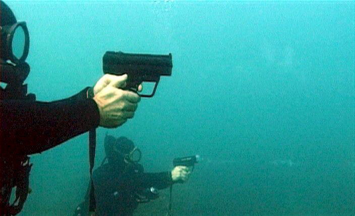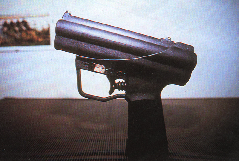 这支P11枪管前方的密封罩已经破损,应该是已经发射完了。据说用户虽然可以自已把有子弹的枪管重新安装到枪身座上,但不能自己往空的枪管内装填子弹。所以每一个发射完5发子弹后的枪管都必须运回工厂重新装填,很麻烦。相比之下,我觉得俄罗斯的SPP-1水下手枪要方便得多,可以自己装填子弹,虽然SPP-1的容弹量少1发。