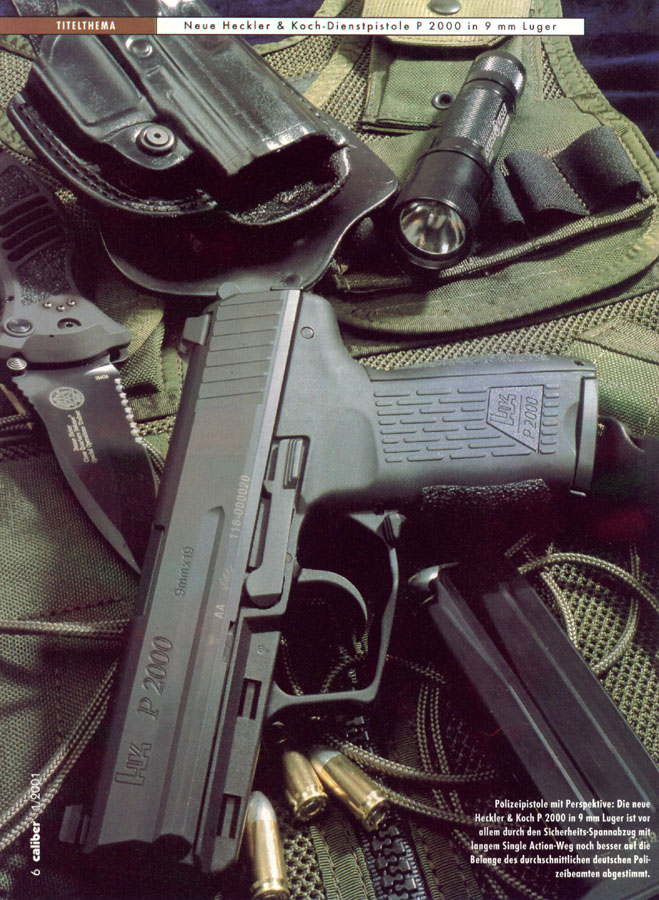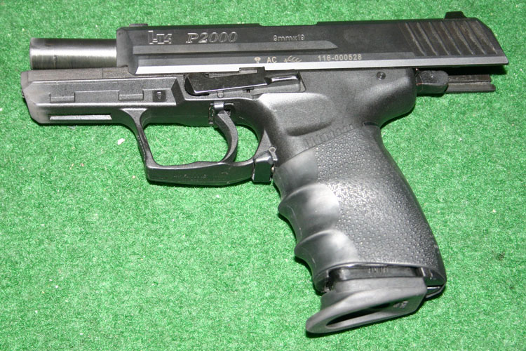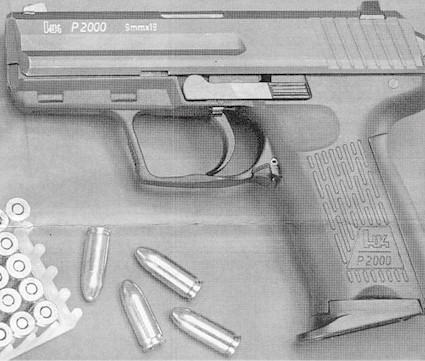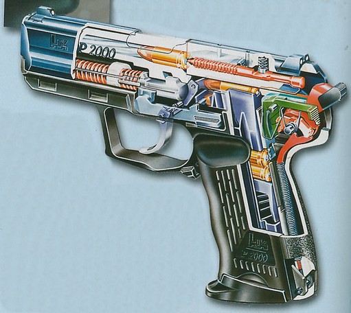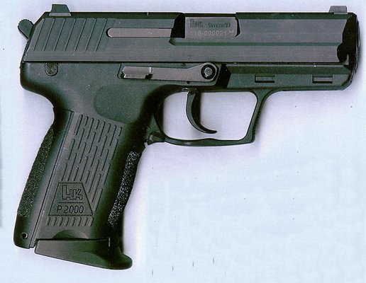 HK P2000手枪是HK公司2000年的新产品,这是以USP为基础,又加上其他一些新特征,而研制出来的新手枪。在P2000在左右侧都有一个空仓挂机柄,不论是左手握枪还是右手握枪,射手都可以用握枪手的姆指方便地按压空仓挂机柄。此外,P2000可以通过更换握把后半部分的组件来改变握把的形状和尺寸,这使得射手可以根据自己手掌的大小来选择合适的握把形状。这个设计意念明显是来自华尔特P99的。