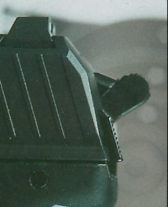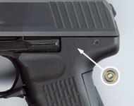 枪口、击锤的特写。击锤左侧有一个待待解脱按钮。