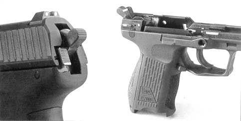 P2000型:在击锤上有创新的扳机与待击阻铁保险,有延长击锤顶纹和待击解脱按钮,可实现单动、双动发射。