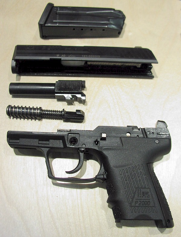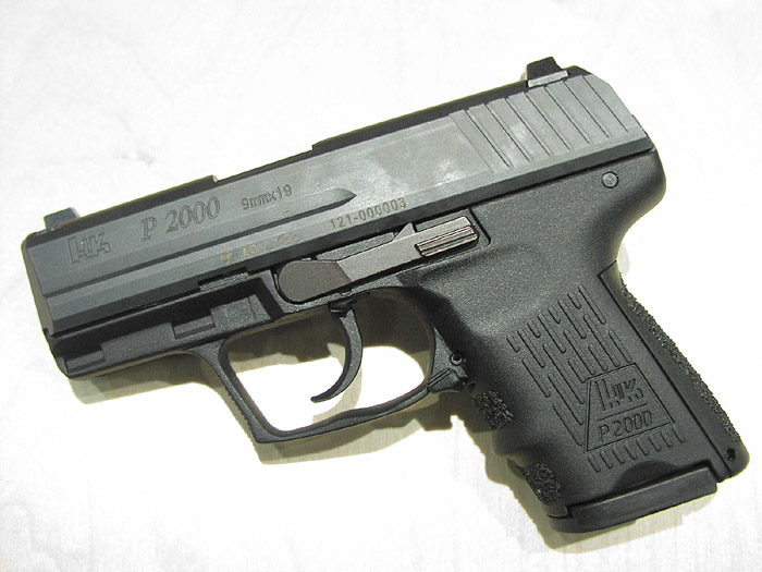 图中的这把枪身上的序号是121-000003,就是说是第3把原型枪。这种枪保留有原尺寸P2000的特征,包括可更换的不同尺寸握把片和两手都可操作的空仓挂机柄,和枪管长度大约三英寸的长度,而且弹匣与原尺寸的P2000通用。在美国民间销售的弹匣将只有10发容量,比欧洲的少。板机系统是HK公司2001年在USP紧凑型上推出的LEM型扳机及双动击锤系统。