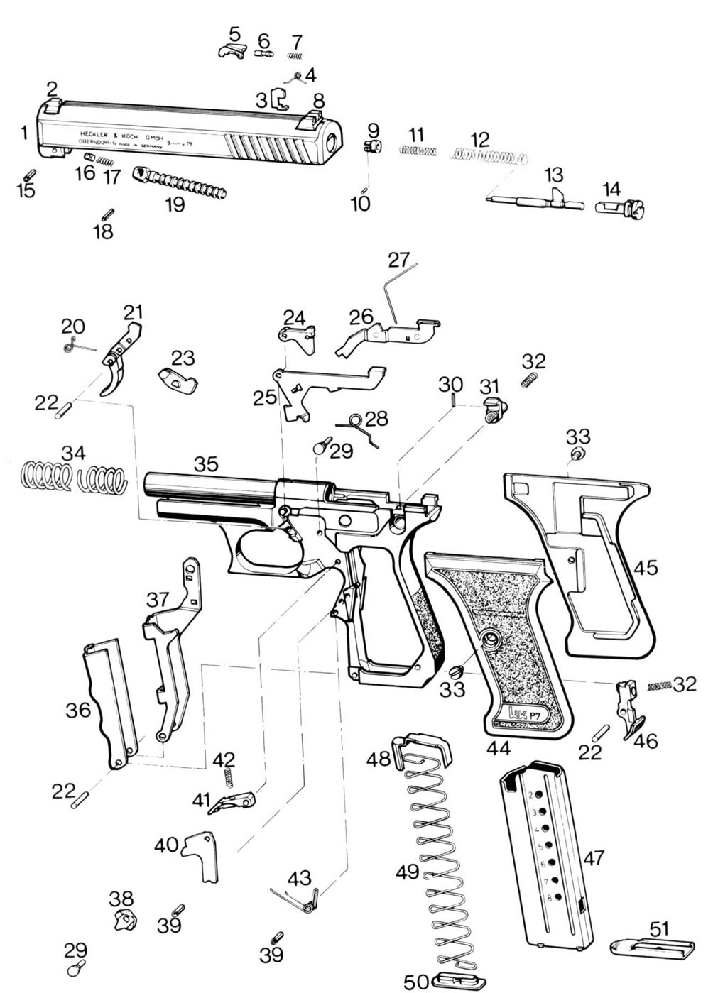 所有的P7枪族的枪身部位都是采用回火钢材(Temperedsteel)制成,而前压板、弹匣与内部零件则是由钢材模压冲锻(Die-stamped)而成,枪管则是以冷锻(Coldforging)方式制成,握把外部则以防滑塑料包裹,