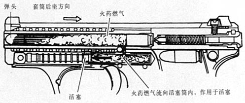 | 扣下扳机后,弹头射出,同时套筒后座,抛出弹壳。 | ![]() |