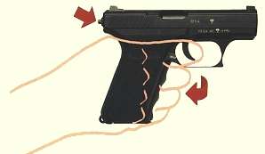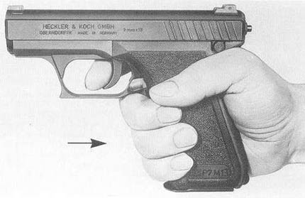 这是一个有趣的问题。关于握把压力,这里有两个概念,第一是压下握把的力量,第二是维持握把压下位置的力量。关于这一点我曾经跟北京网友P7M13聊过。P7的握把并非想人们想象的是用弹簧简单地翘起,然后依靠手压住,而是具有一个半锁功能两档式压柄。具体说你要压下击发握柄(注意,我说是击发握柄而不是保险握柄,因为它的实际作用是启动击发系统,而非保险。),需要相当的力量。这种力量至少是需要你有意识的加力才可以完成。然而一旦你压下握把,会听到卡的一声,握把有一个锁住动作,此时你只需要很小的力量就能够维持握把压下位置。关于压下的力量,HK 在说明书或者其他资料中并未提到(显然不太重要) 但是维持握柄的压力却说得清楚:一点五磅。这是什么概念?单动击发手枪的扳机击发压力是三点五磅到四磅。BERETTA 甚至达到七磅。所以很清楚,P7 手枪压下握把之后,不需要任何额外力量,就可以维持握把。这就是HK 的高明之处。香港那篇文章的说法绝对站不住脚。如果参照拙作“手枪射击的基本训练”一文,我要求射手必须握紧枪把,那时候手握枪的压力何止十倍于P7握把的要求?假如人长时间握枪处于作战状态,那时手疲劳可能也是因为紧紧握枪,而非应付握把。我很怀疑得出这种结论的人是出于一种心理感觉。至少我自己使用P7时不是这样。写到此处我拿出我的P7 试验,发现握把压住之后还有一个放松的宽容度。你卡地压下之后,轻轻放松握把,握把压力很轻地跟随你的手指放松,到放松到一定程度时,才会又卡地一时,释放击发系统。也就是说你射击时万一不慎手在座力之中松脱一下(这种情况经过训练的人不可能发生),握把也不可能退回。P7 是一种你越研究越觉得高明的手枪。