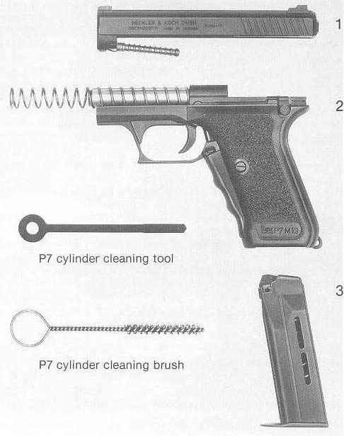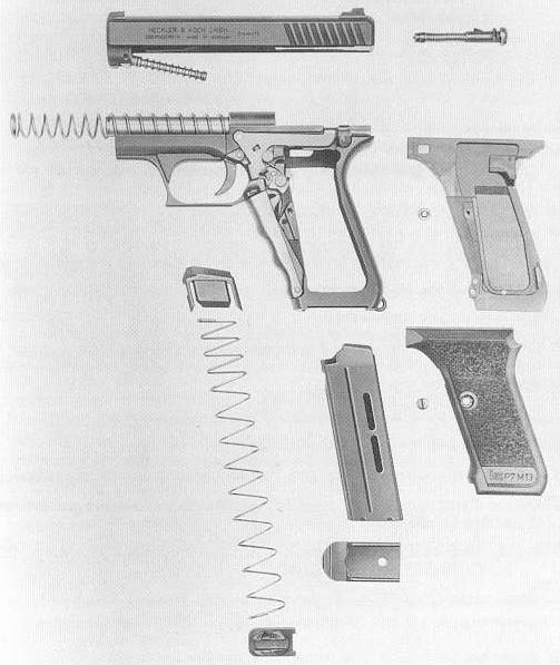 与一般人所想像不同的是,P7的全新设计不但没有使零件数量增加,相反的,P7手枪所用的零件数比起当时的传统自动手枪反而少了将近40%,而且所有零件的组装、 拆卸也相当的简易方便,但与其他HK的产品一样,P7手枪精密、可靠、准确——而且昂贵!而这也是P7M13会在1984年的美军新型军用手枪竞标落败的主要原因之一,而另一个主要原因则在耐用性上。当时在这个测试中,超过20家厂商的多达30多种型号的手枪经过历时达3年的对比试验,进行了3个批次的射击、精度、耐污、温差等种种严格测试,而P7M13的耐用性就因此受到严重的挫折,原因正是在于其气体延迟后坐的设计。