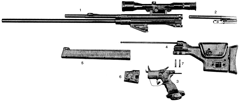 PSG-1的基本结构与G3相同,但使用了加厚的重型枪管,所以全枪重量比较大。重枪管的主要是在射击时依靠枪管自身的重量减小枪管的振动,基于同样的目的,枪口部没有安装消焰器、制退器之类的任何枪口装置,在1970年代大多数狙击步枪都采用这样的设计,主要是担心枪口装置影响了弹头出膛时的一致性表现。另外在机匣右侧有一个类似M16的辅助推机枪的装置,这是用于低噪音上膛闭锁的装置。此外PSG-1的弹膛由于有纵向凹槽,打过的弹壳不能用于复装(G3的通病),如果使用消声器的时候也不能使用亚音速弹。 PSG-1的握把为比赛步枪用的握把,塑料枪托的长度可调,枪托上的贴腮板高低可调,射手可以调节到最舒适的长度和高度。PSG-1的扳机力比G3轻得多,大约在1.5公斤(约3.3磅)左右,扳机力可调整。PSG-1可以选用两脚架或三脚架支撑射击,两脚架比较方便,但如果要求高精度,使用配套的小型三脚架会更稳定。 HK公司原配的瞄准鏡是亨索尔特(Hendsoldt)ZF6x42,瞄准镜的射程调整只有从100到600米,而且最佳使用距离是在60至100米范围内。所以虽然官方资料称PSG-1的有效射程达800米,但如果不换合适的瞄准镜,但实际应用只适合在600米左右。另外PSG-1不像其他军用狙击步枪那样装有应急的机械瞄具,而只能用瞄准镜瞄准。 |