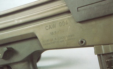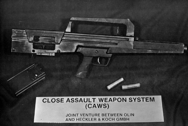 1982年,美国三军轻武器规划委员会提出了近战突击武器系统(Close Assault Weapon System)计划,研制一种能够在100~150射程内有效发射高冲击、多弹头的近战武器,当时参与投标的共有4家公司,HK公司就是其中之一,他们提交的样枪被命名为CAW。其他三个竞争对手分别是AAI CAWS、Jackhammer和弗兰齐SPAS-15。但到1990年代初,由于美国ACR(先进战斗步枪)计划思想的影响,CAWS计划受到排斥,Olin/HK CAW的研制就只好停止了。