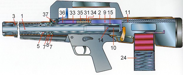 霰弹枪本身由HK公司位于美国弗吉尼亚州的子公司研制,该枪采用采用枪管后坐式工作原理,闭膛待击,但有导气式装置辅助开锁,以便于在发射低压的特殊弹药时也能可靠地开锁。该枪采用无托结构,外壳用高强度塑料制成,外形与G11略有相似。机匣上方的提把有几种样式,一种为内装单倍光学瞄准镜的筒形提把,一种是比赛手枪相类似的前后机械瞄具。保险/快慢机柄位于扳机上方的机匣两侧,有三个位置,分别为保险、半自动和3发点射,3发点射时射速约240RPM,但由于所发射的是霰弹,这样的射速是足够了。