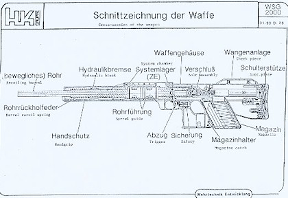 对于步枪本身的研究,HK公司并不仅仅是在纸上或在一台CAD机器上进行设计,WSG2000已经发展到全尺寸模型及设备功能试验阶段了,它采用回转式枪机闭锁系统和长行程后座,并带有后座缓冲系统。WSG2000计划的最终结束是由于缺乏发展资金,包括HK公司内部的资金和赞助的外部客户,WSG2000甚至还没有机会进行装填、射击、抛壳的试验。