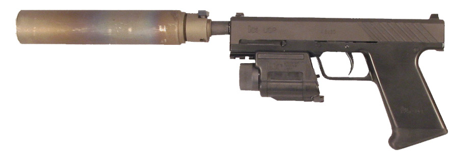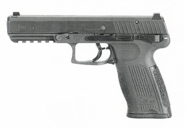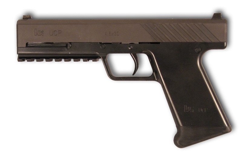 上图是最新的P46手枪,但也许还不是最后的生产型。这种手枪的计划可以追溯到2002年,当时HK公司完成了MP7的研制计划,当德国军队试验MP7时要求HK公司也研究弹药通用的手枪。HK公司最初研制出来的样枪被命名为UCP,即“终极战斗手枪”——Ultimate Combat Pistol(奇怪的是居然有另一种说法是Universal Combat Pistol——通用战斗手枪)。UCP的原型枪在2003年底公开,参加了法国巴黎2003年11月18-20日举办的国际军警用装备展(Milipol 2003),根据HK公司公布的计划的,在整个2004年期间继续测试UCP,并计划在2004年年底让可能的军方和警方客户评估该枪样品,并计划在2005年初开始批量生产。但它的外形太丑陋(下面的两张图为UCP原型),所以没有像FN公司的Five-seveN手枪那样引起人们的兴趣。