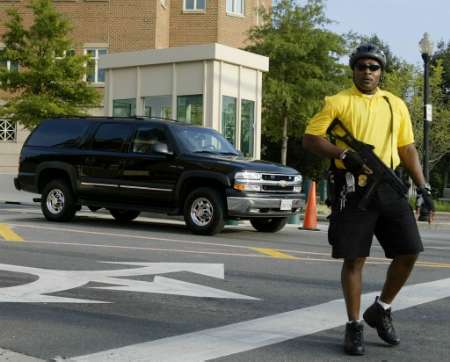 2002年10月4日,美国的塔利班士兵约翰·沃克·林德(John Walker Lindh)被送到弗吉尼亚州亚历山大市的法庭受审,沿途有警察保护押送他的黑色汽车,图中此人就携带UMP40。