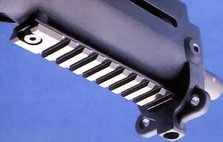 UMP45的顶部、护木左右两侧及下侧都可以很方便地安装上RIS导轨,任何符合美国MIL-STD-1913军用标准的枪用辅助装置都可以安装在导轨上,如小握把、瞄准镜、战术灯、激光瞄准具等。因为UMP45根本就是为了美军特种部队设计的。 |