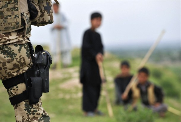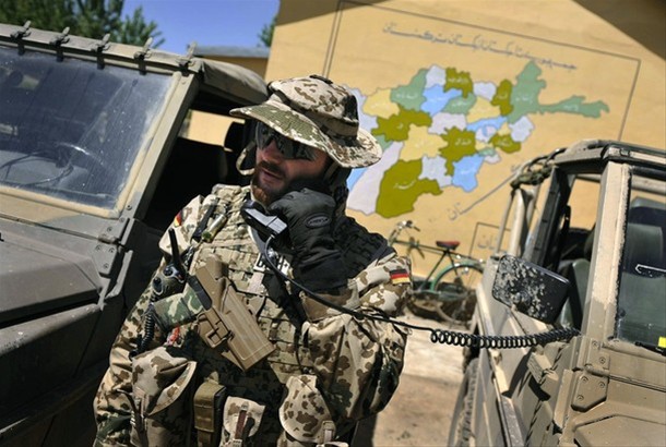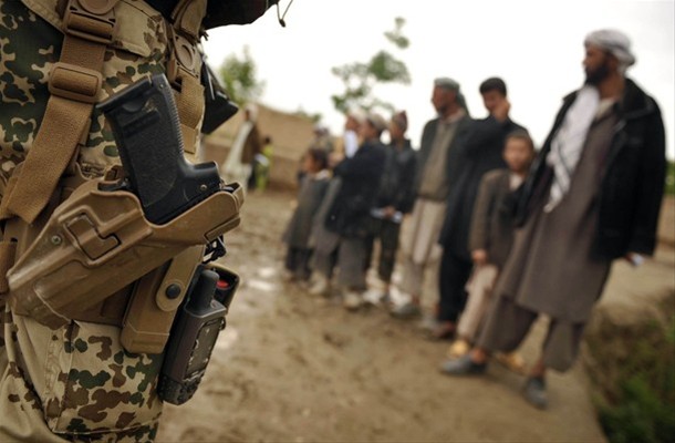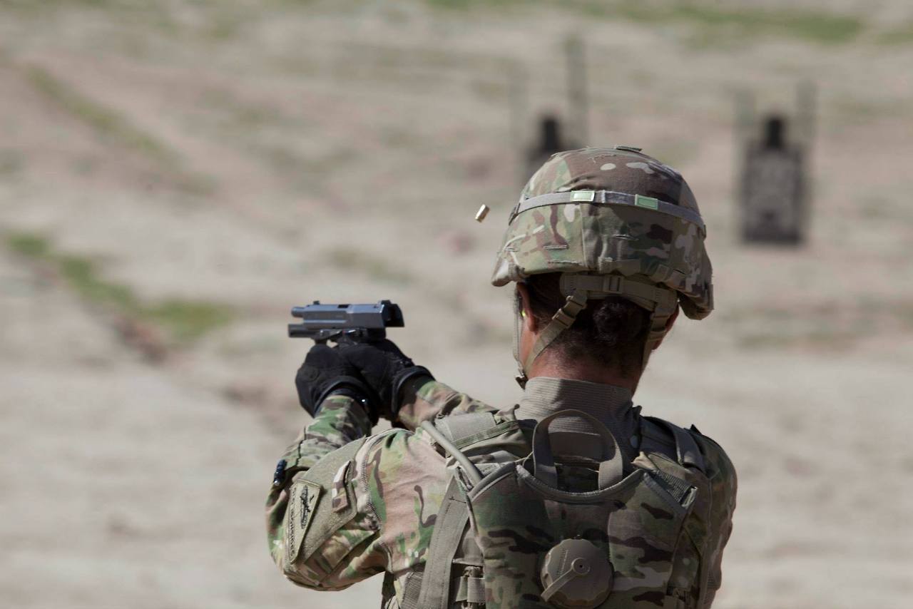 2014年美军与德军在阿富汗的马扎里沙里夫展开联合训练中,美军士兵在使用德军的P8手枪
