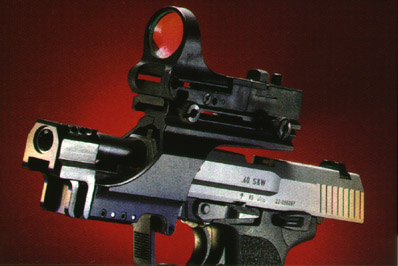 加装IPSC比赛用附件的USP40,包括枪口制退器和反射式瞄准镜