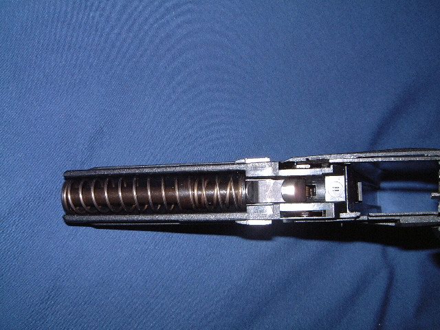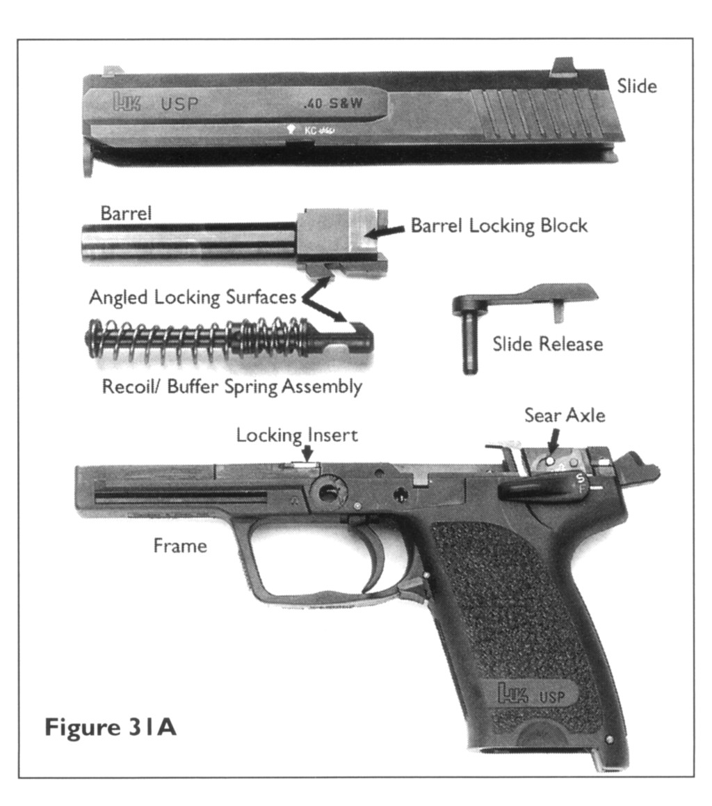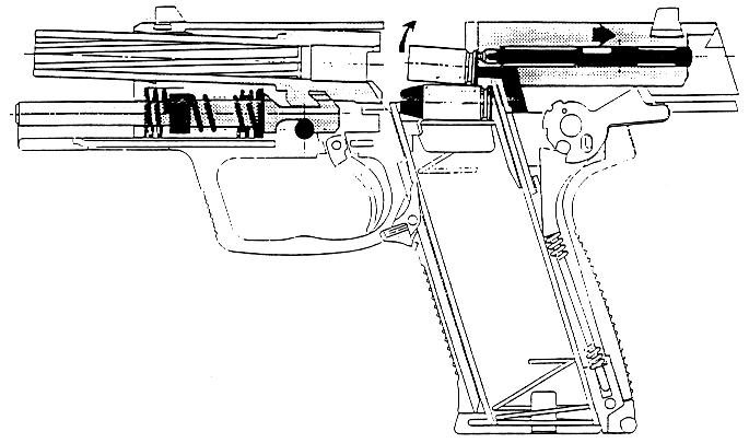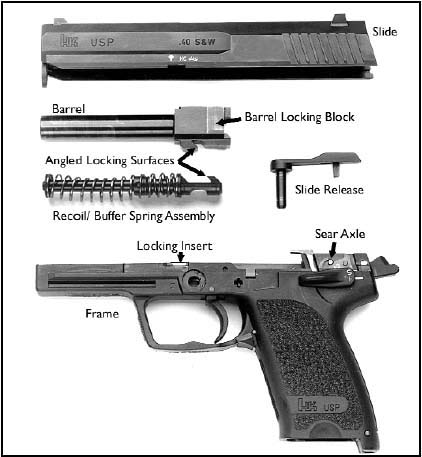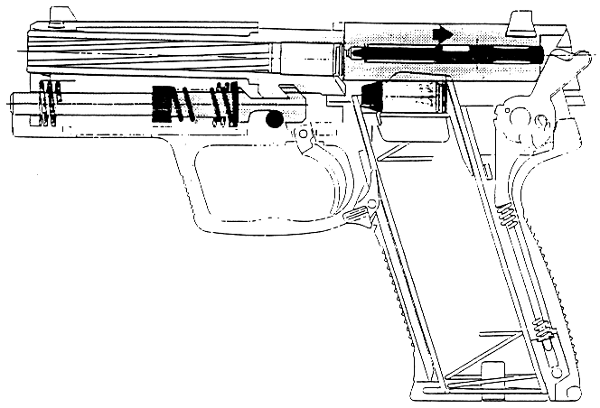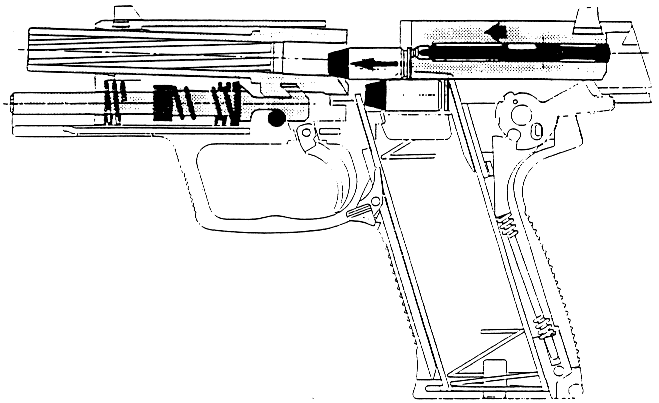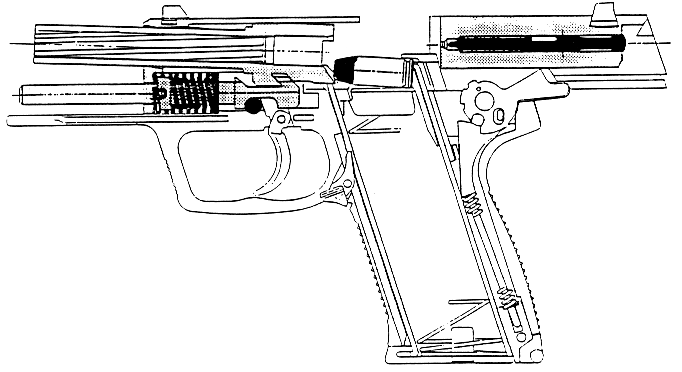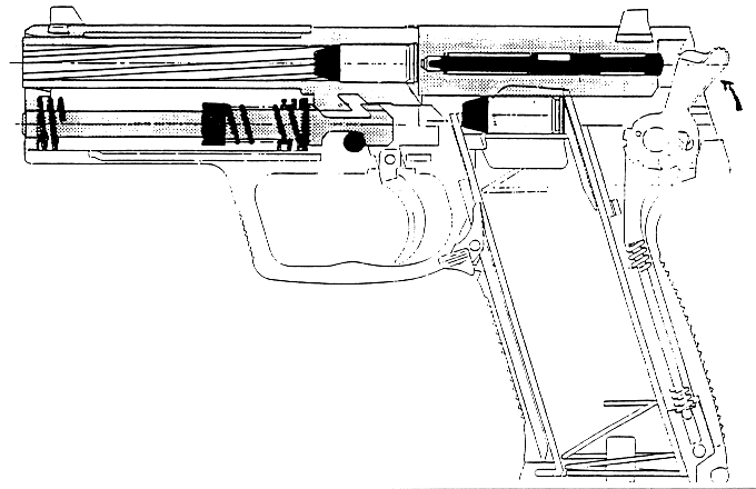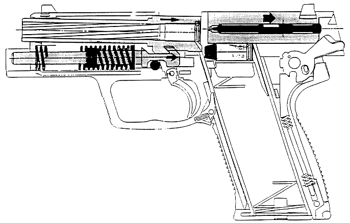 USP采用勃朗宁式闭锁,复进簧导杆上有很独特的后座缓冲装置,这种缓冲装置已经申请了专利。