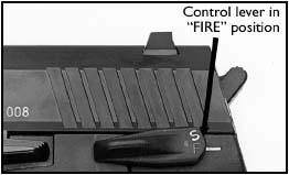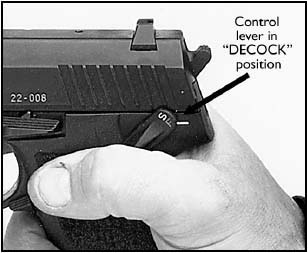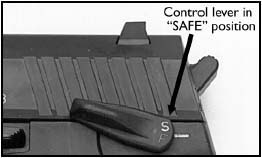 | 组合1 DA/SA,保险杆在左侧,保险杆向上扳,处于保险状态。位于中间位置,为单动状态;位于下方位置,击锤处于待击解脱状态,手枪为双动射击。 | 组合2 DA/SA,保险机构不变,但保险杆位于右侧,主要供左手射手使用。 | 组合3 DA/SA,没有保险装置,只有一个类似SIG P226上的待击解脱杆。 |