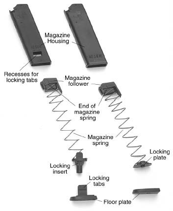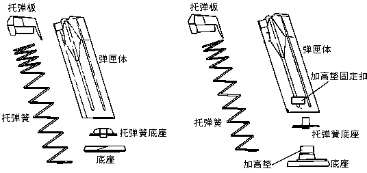 左为一般的弹匣,主要销售给执法者或欧洲国家,而民用型的弹匣(右)容量只有10发,因此弹匣底座加高了。