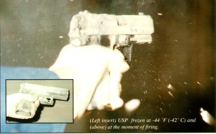 正在进行低温试验的USP,USP虽然是为进入美国民间市场而研制的,但还是经受过严格的试验,在许多USP的破坏性试验中,已经超过北约AC-225标准的要求了。