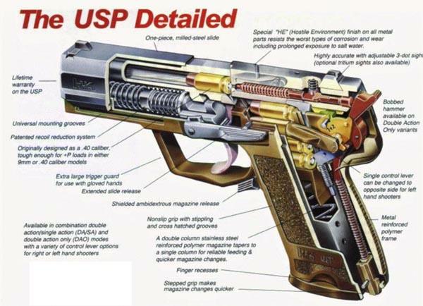 USP可以发射最大威力的9mm枪弹,因为USP本来就是按发射.40弹的规格来设计制造的。无论那一种口径的USP都有9种型号,不同型号间的区别只是扳机方式、控制杆功能和位置的不同,这样就给用户一个较大的选择空间,而且每一种型号都可以任意修改为另一种型号。USP虽然价格较贵,但其精度极佳、耐用性强,人机工效设计得好,后坐力也容易控制。尤其是其握把设计极佳,让人自然握紧握正,在凭感觉打时指向性极佳,在指向性和握持舒服方面比Glock手枪都要好。
