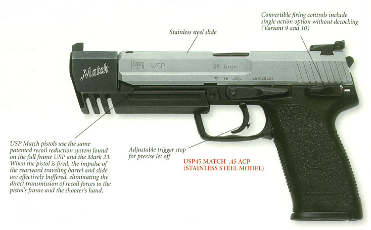 USP Match比赛手枪与其他的比赛手枪相比,其变化较简单,只是在原来的USP标准型手枪上利用其UTL战术灯导轨固定一个枪口防跳器,并增加扳机力调整功能。这个枪口防跳器是在一个枪品配置装置的上方开一道大形的缺口,使手枪在射击时,枪口的火药燃气向上逸出,从而起到止跳作用;而在扳机后方有一个不起眼的钉形物,便是用于调整扳机力的装置;另外USP Match的准星照门也改为可调整的。USP Match在可以使用标准型的大容量弹匣,但在美国只能使用10发弹匣。